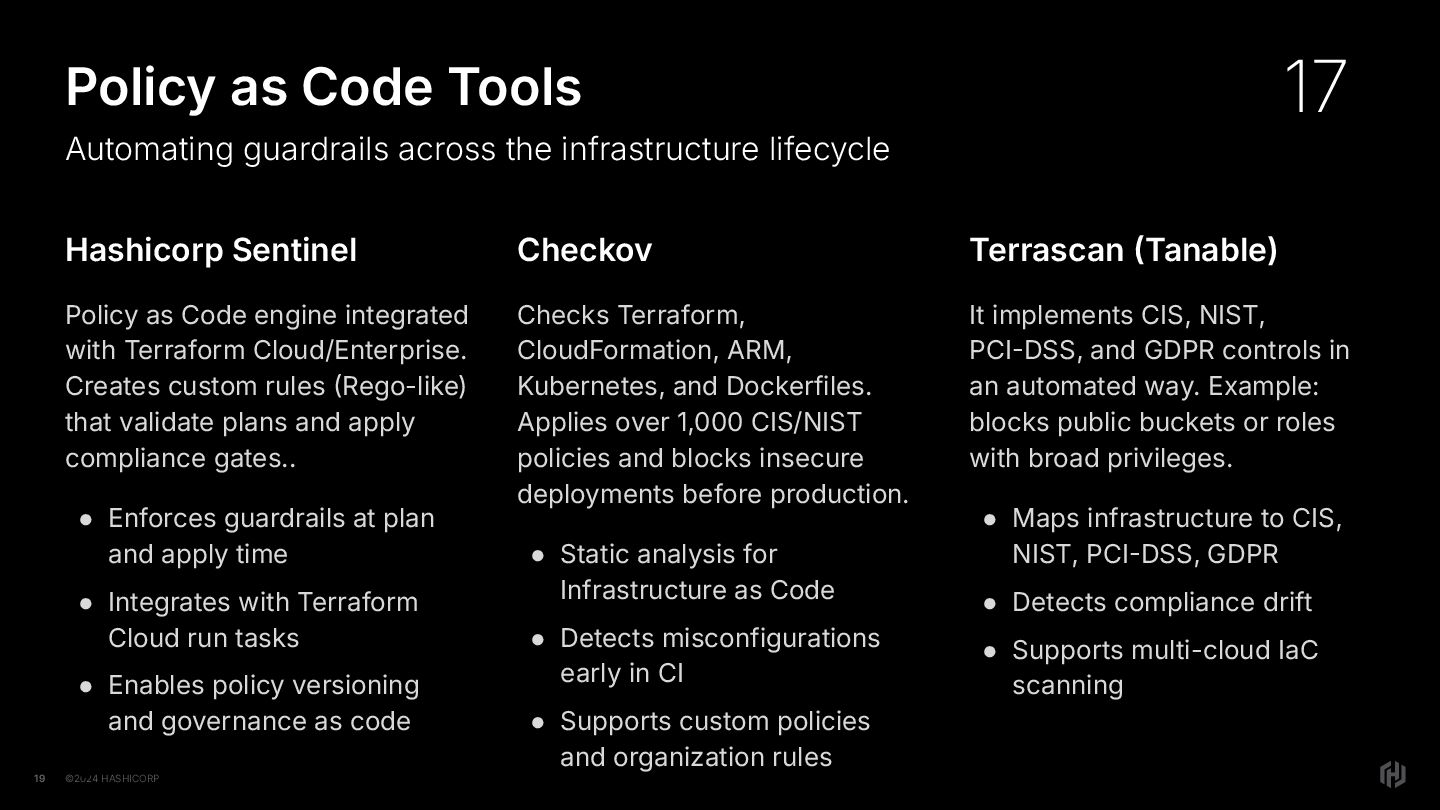 Terraform Cloud/Enterprise. Creates custom rules Rego-like) that validate plans and apply compliance gates.. • Enforces guardrails at plan and apply time • Integrates with Terraform Cloud run tasks • Enables policy versioning and governance as code • 19 Policy as Code Tools Automating guardrails across the infrastructure lifecycle Checkov Checks Terraform, CloudFormation, ARM, Kubernetes, and Dockerfiles. Applies over 1,000 CIS/NIST policies and blocks insecure deployments before production. • Static analysis for Infrastructure as Code • Detects misconfigurations early in CI • Supports custom policies and organization rules Terrascan Tanable) It implements CIS, NIST, PCIDSS, and GDPR controls in an automated way. Example: blocks public buckets or roles with broad privileges. • Maps infrastructure to CIS, NIST, PCIDSS, GDPR • Detects compliance drift • Supports multi-cloud IaC scanning 17