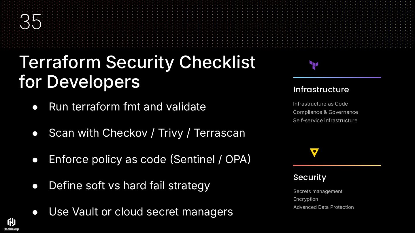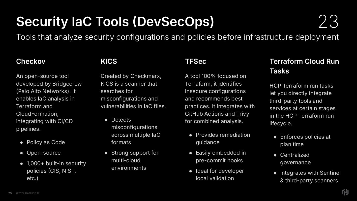 Palo Alto Networks). It enables IaC analysis in Terraform and CloudFormation, integrating with CI/CD pipelines. • Policy as Code • Open-source • 1,000+ built-in security policies CIS, NIST, etc.) 25 Tools that analyze security configurations and policies before infrastructure deployment KICS Created by Checkmarx, KICS is a scanner that searches for misconfigurations and vulnerabilities in IaC files. • Detects misconfigurations across multiple IaC formats • Strong support for multi-cloud environments TFSec A tool 100% focused on Terraform, it identifies insecure configurations and recommends best practices. It integrates with GitHub Actions and Trivy for combined analysis. • Provides remediation guidance • Easily embedded in pre-commit hooks • Ideal for developer local validation Terraform Cloud Run Tasks HCP Terraform run tasks let you directly integrate third-party tools and services at certain stages in the HCP Terraform run lifecycle. • Enforces policies at plan time • Centralized governance • Integrates with Sentinel & third-party scanners Security IaC Tools DevSecOps) 23