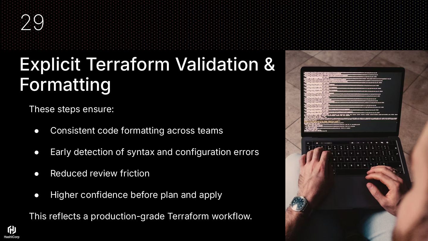 Consistent code formatting across teams • Early detection of syntax and configuration errors • Reduced review friction • Higher confidence before plan and apply This reflects a production-grade Terraform workflow. 29