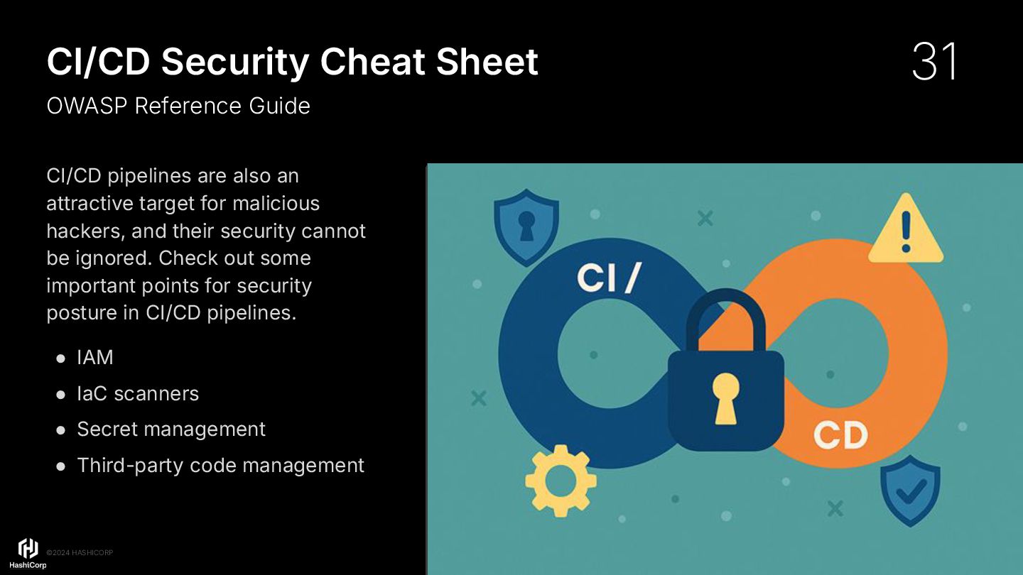 for malicious hackers, and their security cannot be ignored. Check out some important points for security posture in CI/CD pipelines. • IAM • IaC scanners • Secret management • Third-party code management CI/CD Security Cheat Sheet OWASP Reference Guide 31