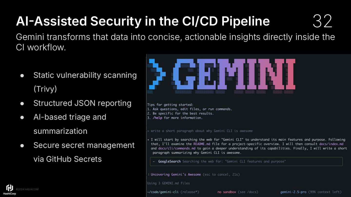 JSON reporting • AI-based triage and summarization • Secure secret management via GitHub Secrets AIAssisted Security in the CI/CD Pipeline Gemini transforms that data into concise, actionable insights directly inside the CI workflow. 32