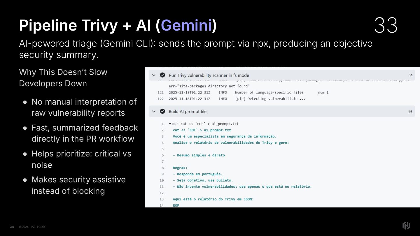 No manual interpretation of raw vulnerability reports • Fast, summarized feedback directly in the PR workflow • Helps prioritize: critical vs noise • Makes security assistive instead of blocking Pipeline Trivy + AI (Gemini) AI-powered triage Gemini CLI sends the prompt via npx, producing an objective security summary. 33