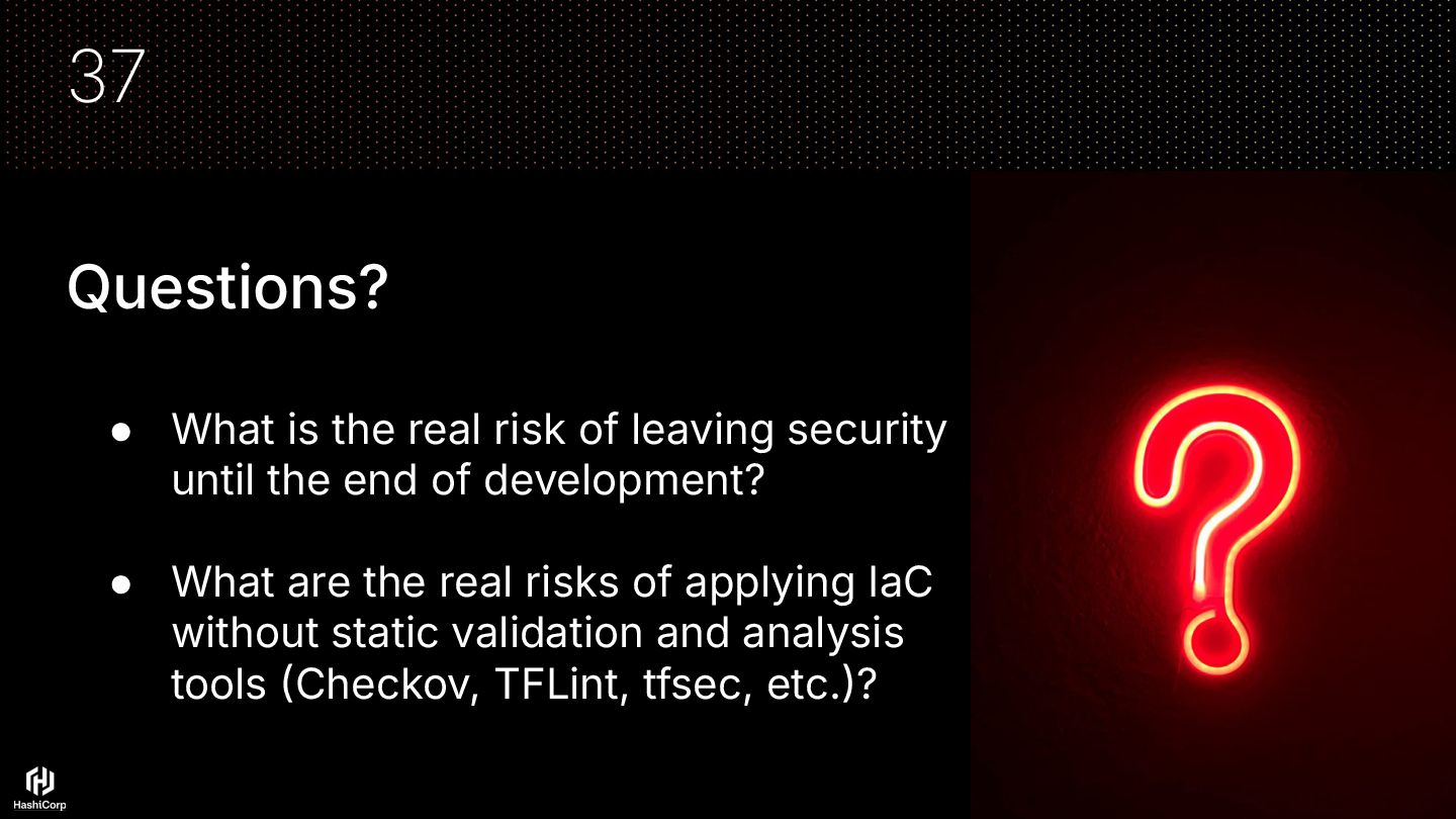 security until the end of development? • What are the real risks of applying IaC without static validation and analysis tools Checkov, TFLint, tfsec, etc.? 37