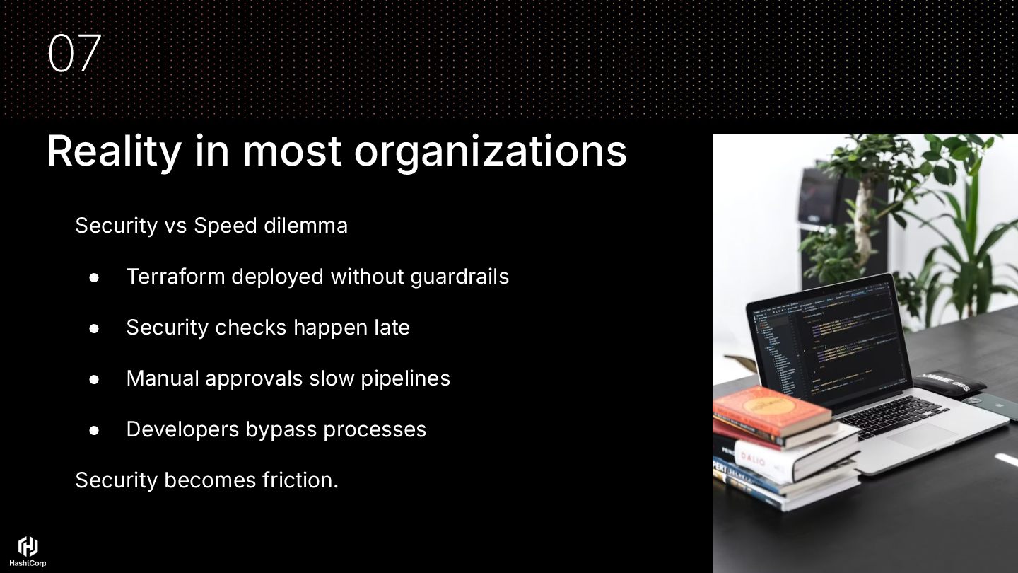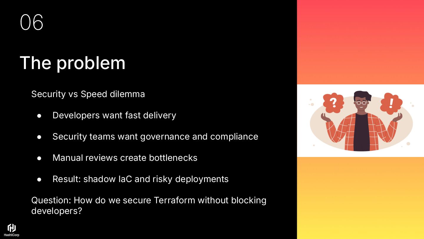 want fast delivery • Security teams want governance and compliance • Manual reviews create bottlenecks • Result: shadow IaC and risky deployments Question: How do we secure Terraform without blocking developers?