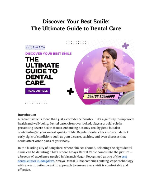 Looking for the best dental clinic in Bangalore? Amaya Dental Clinic is renowned for its expert team of the best dentists in Bangalore, offering advanced dental care in a comfortable environment. From routine check-ups to specialized treatments, your smile is in great hands with us.