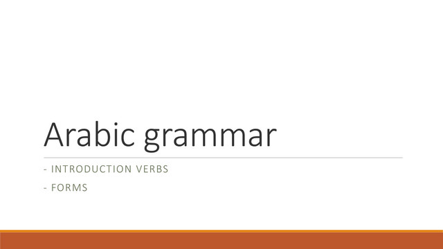 IV, VII, VIII, X •a/a type: V, VI, IX •In present tense form I starts with the short vowel ‘a’ in the prefixes (yadrusu). This is not the case in all forms: ◦ Present tense starts with yu/tu/’u/nu: II, III, IV ◦ Present tense starts with ya/ta/’a/na: V, VI, VII, VIII, IX, X •In what follows you will see the conjugations of each form