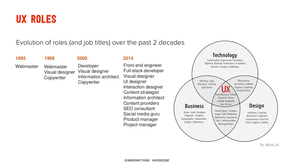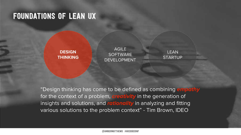 30 minute overview of the foundations of UX, design thinking, agile methodology, lean startup. Looking at assumptions, hypothesis statements, personas, journey maps, measurement and UX ≠ UI.