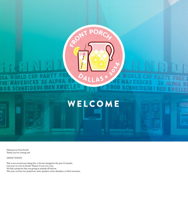 NOTES] This is our second year doing this. A lot has changed in the past 12 months. Last year, we were at Kessler Theater. It was very cozy. We had a projector that was giving us attitude off and on. This year, we have two projectors, more speakers, more attendees, so that’s awesome.