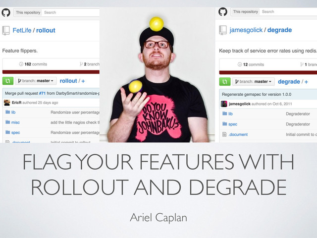 In light of James Golick's recent untimely passing, here's a brief overview of rollout (https://github.com/FetLife/rollout) and degrade (https://github.com/jamesgolick/degrade), 2 gems which provide a simple interface for dynamic activation and deactivation of your app's features. We'll discuss why we might want to use feature flags and how to implement them using James' gems.