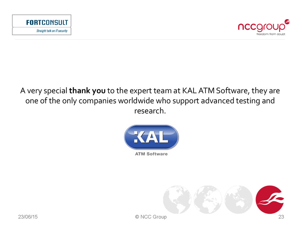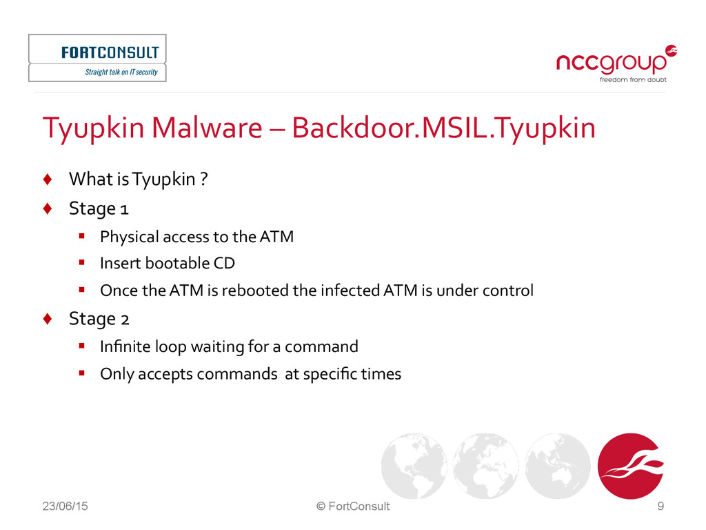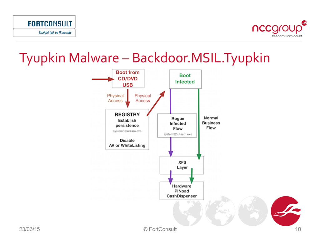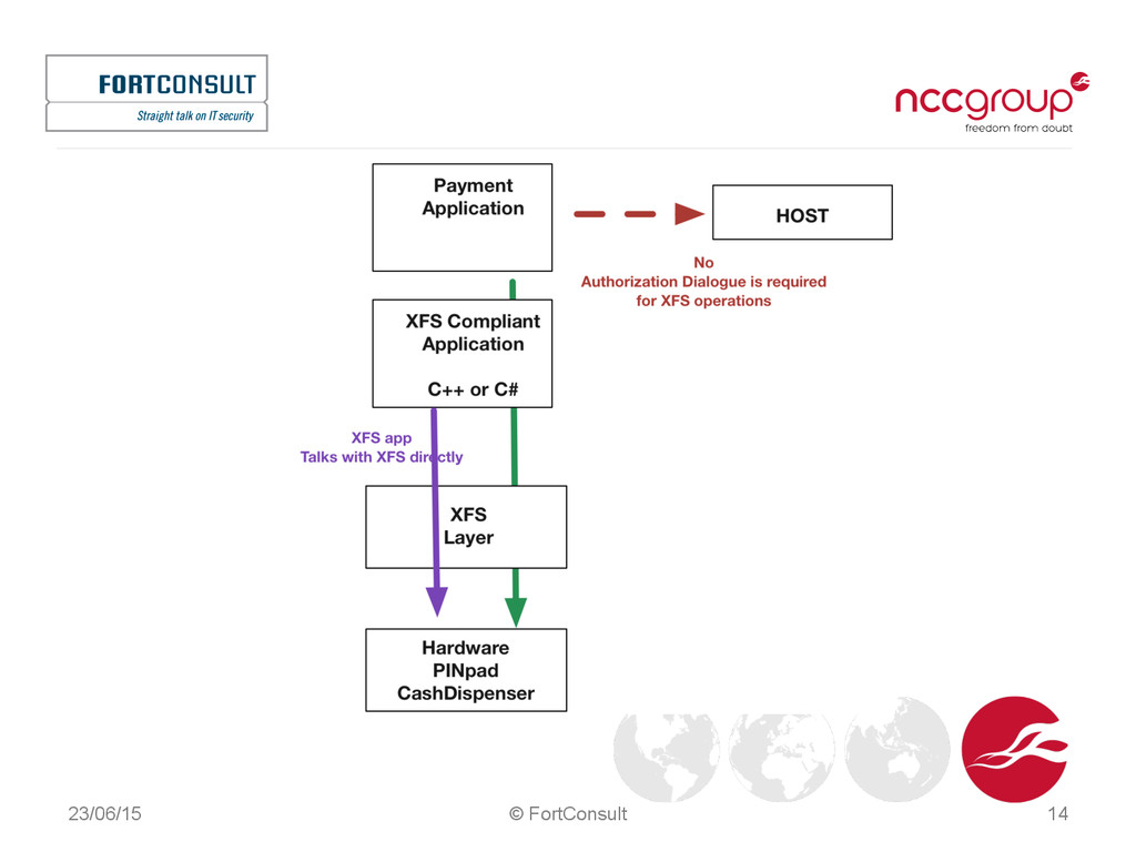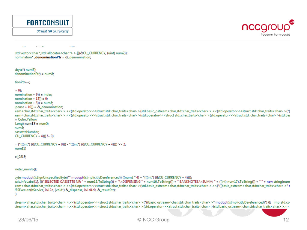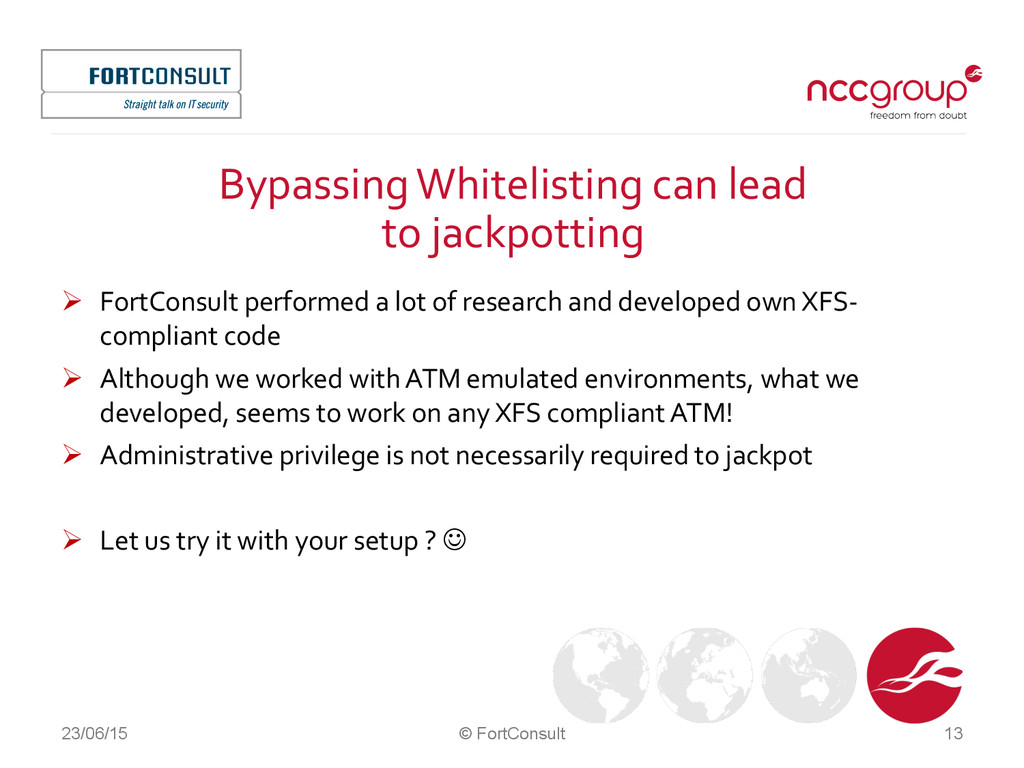 ATM compromise through the use of malicious software is on the increase across the world. At EAST FCS 2015 a demonstration showed how a Windows ATM platform can be compromised by known malware. The demo featured a virtual ATM machine running on Windows 7, emulating a XFS layer.