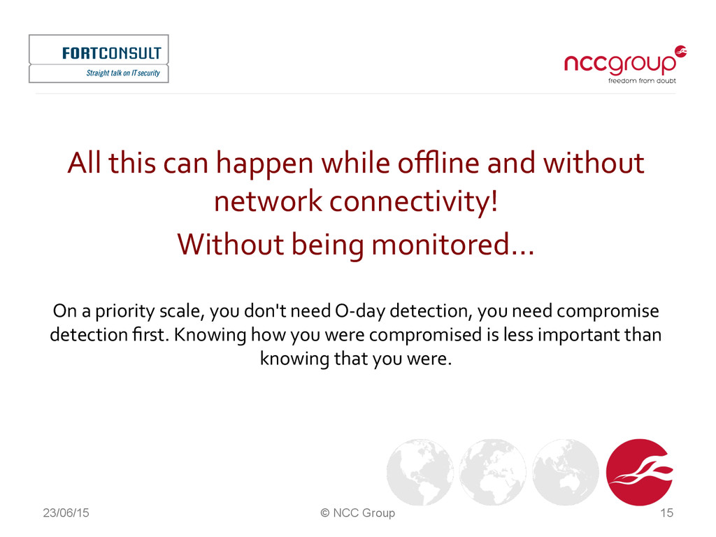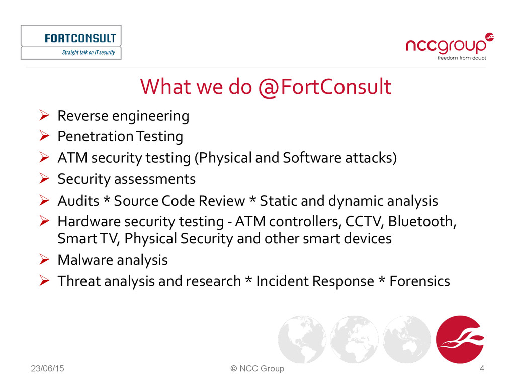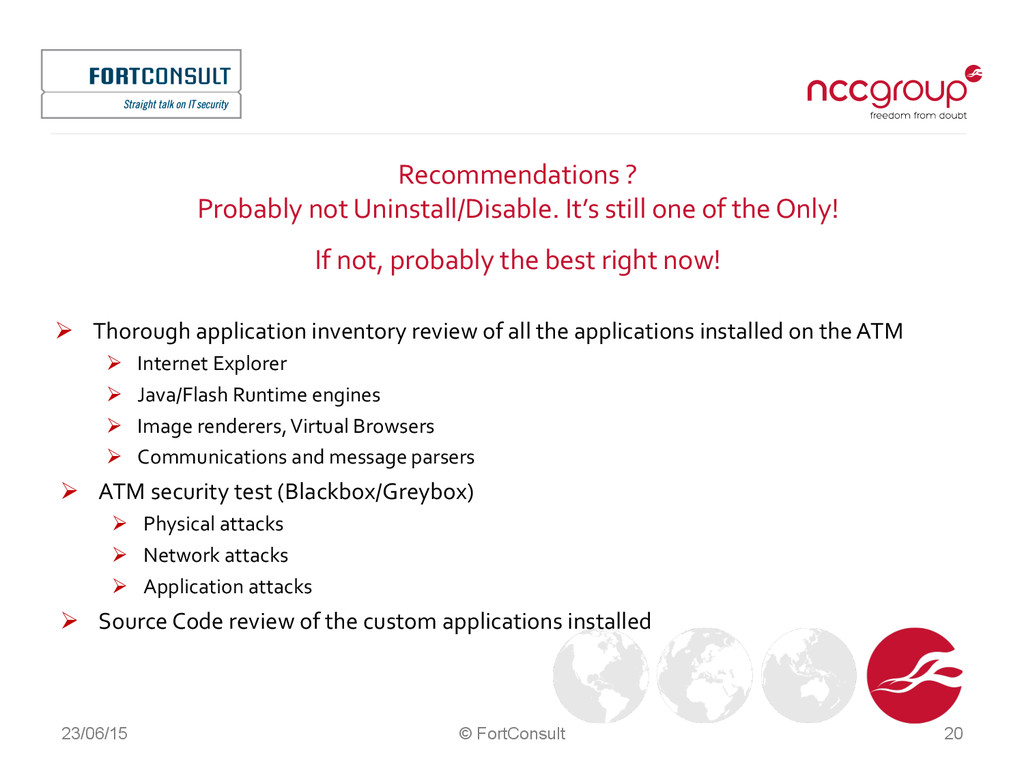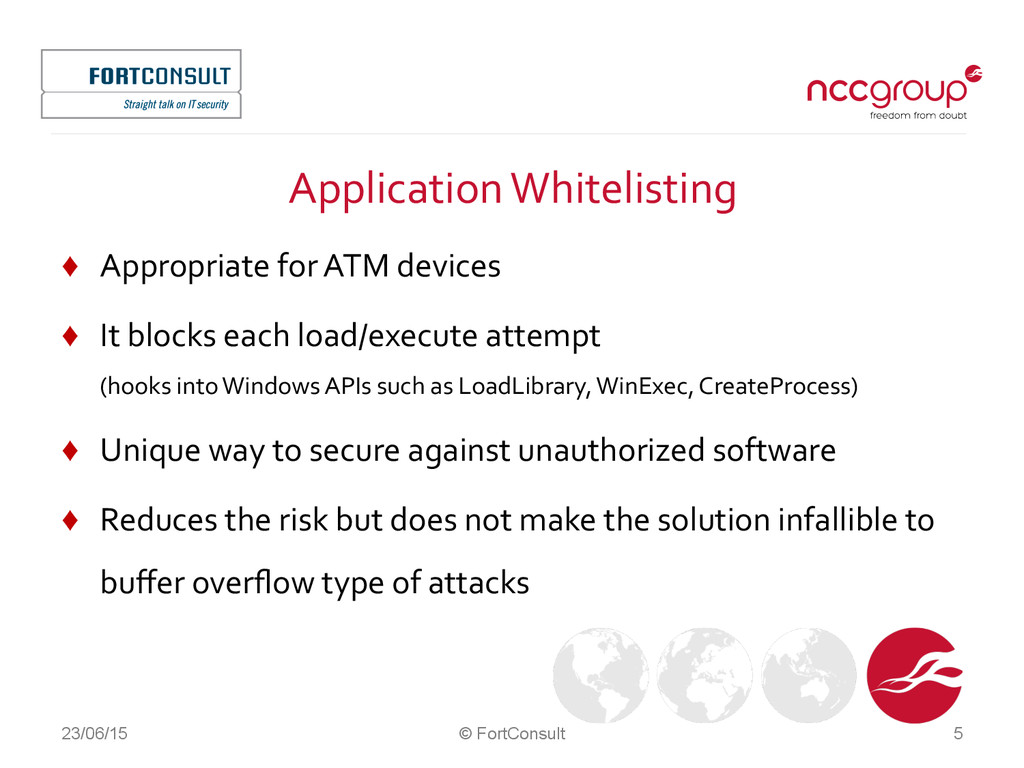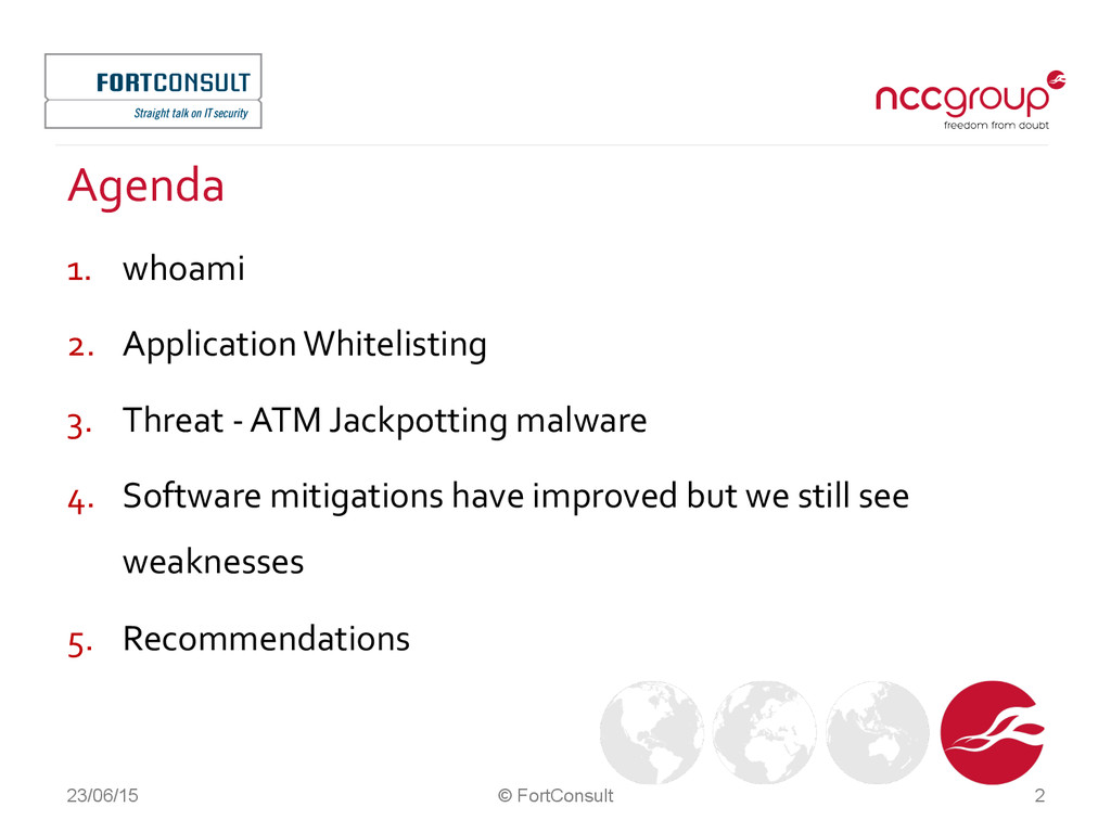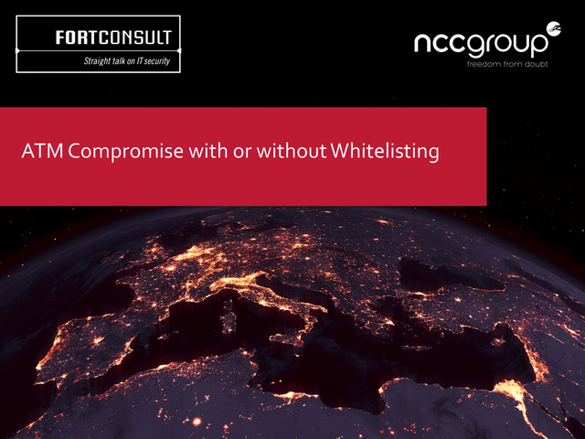 ATM compromise through the use of malicious software is on the increase across the world. At EAST FCS 2015 a demonstration showed how a Windows ATM platform can be compromised by known malware. The demo featured a virtual ATM machine running on Windows 7, emulating a XFS layer.