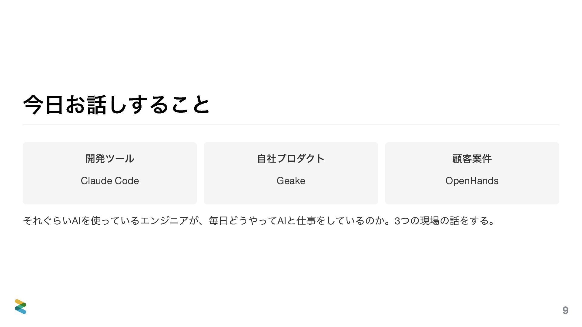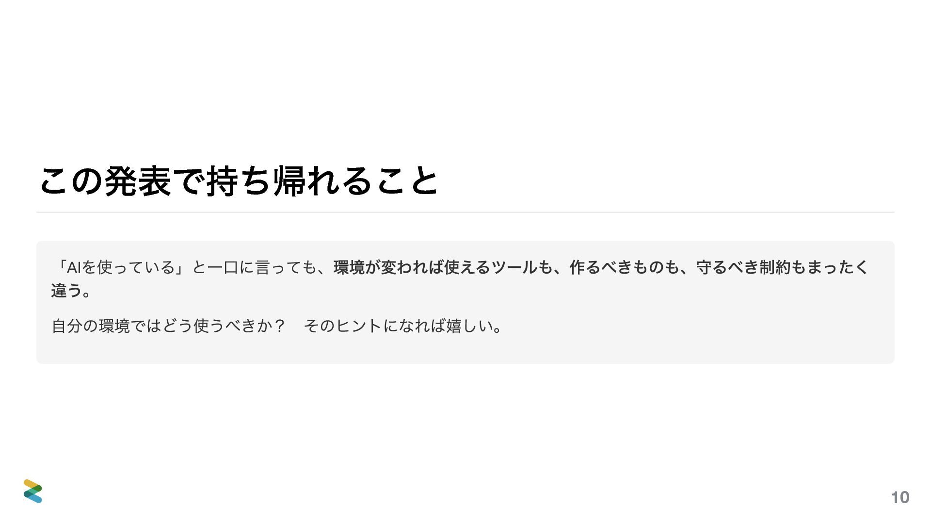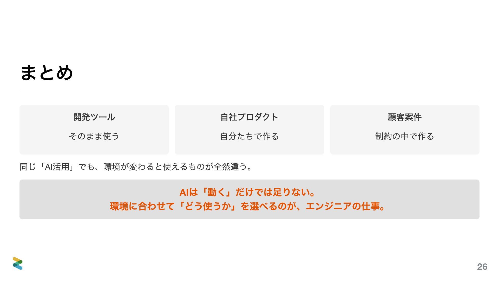 「AIを使っている」と一口に言っても、環境が変われば使えるツールも、作るべきものも、守るべき制約もまったく 違う。3つの例(開発ツール、自社プロダクト、顧客案件)を通して、自分の環境ではどう使うべきか? そのヒントになれば嬉しい。