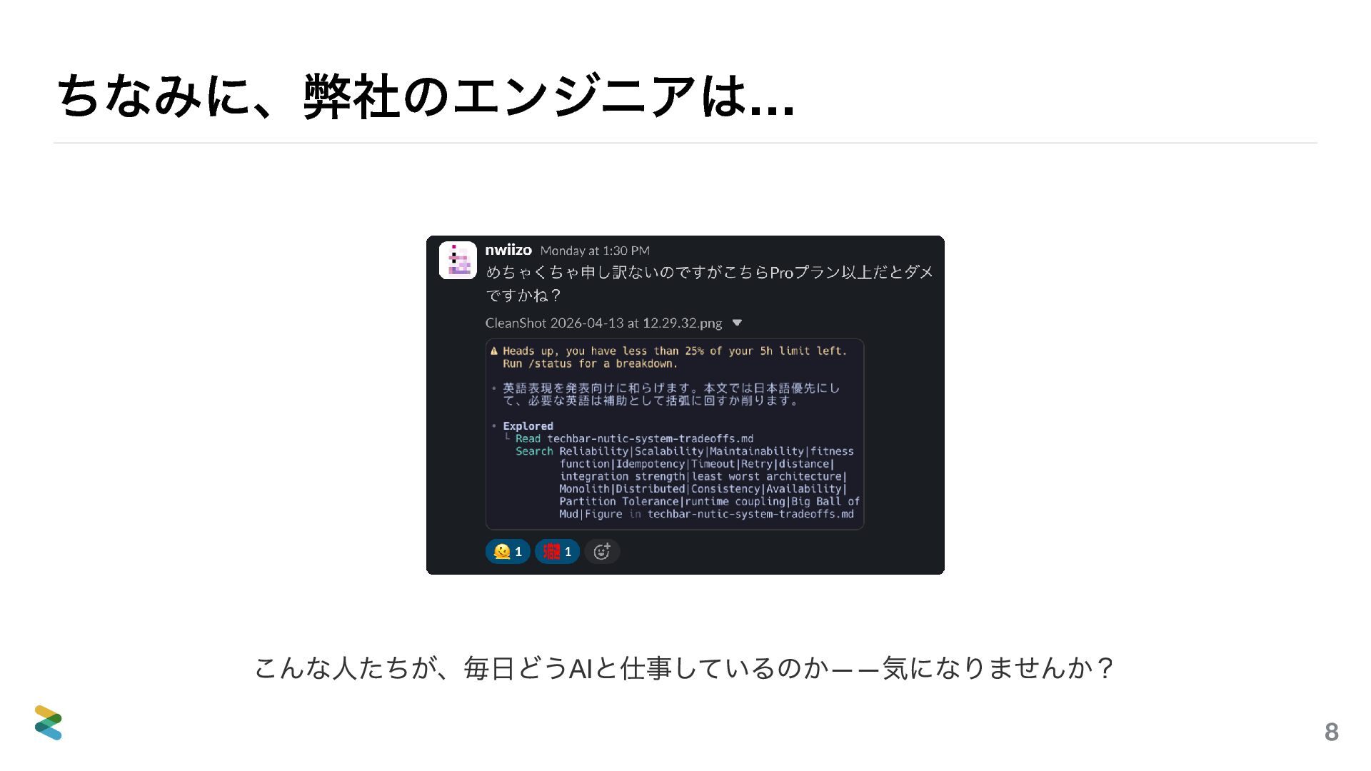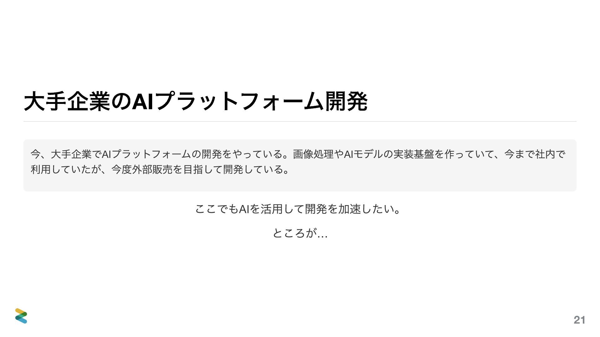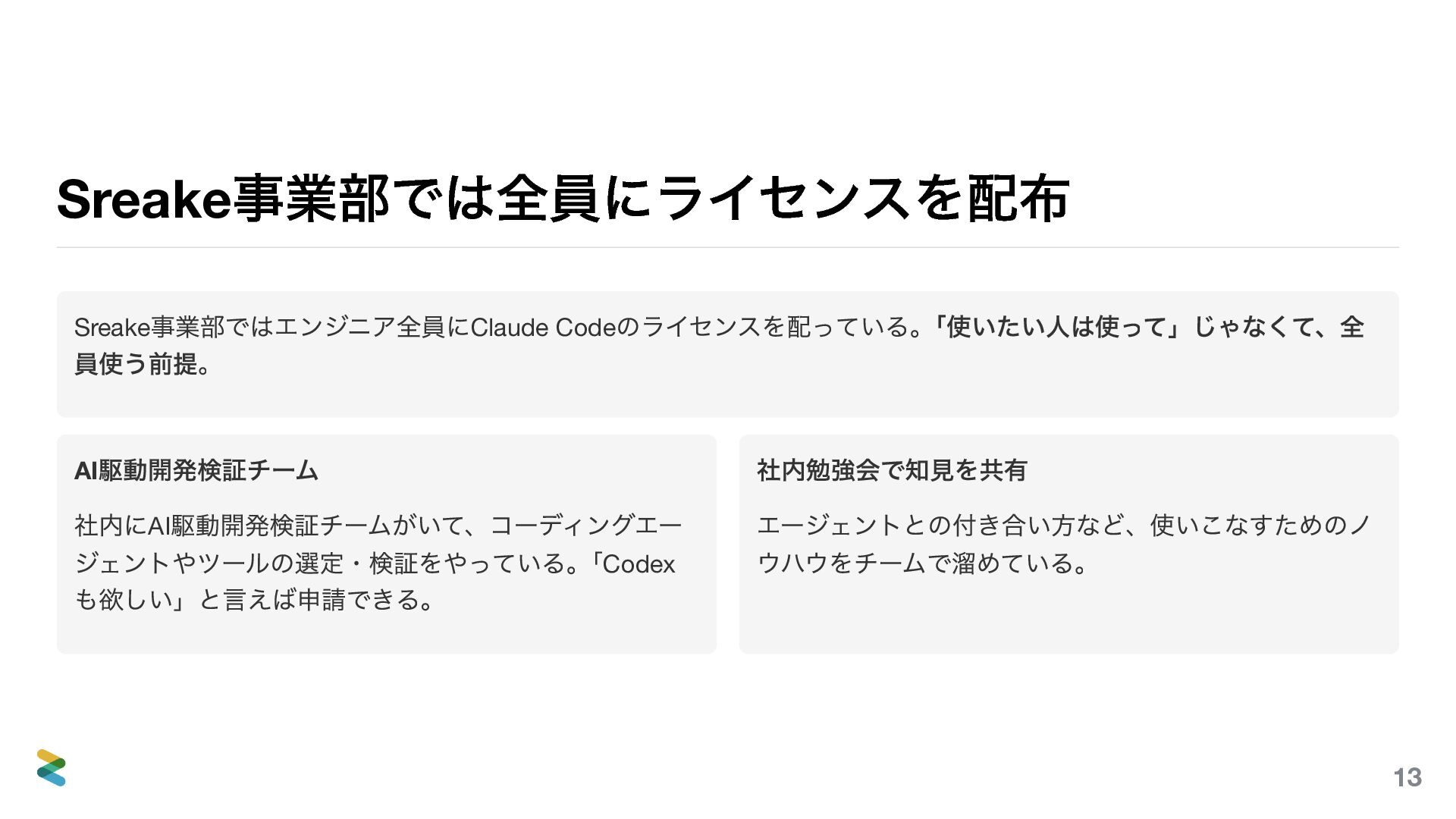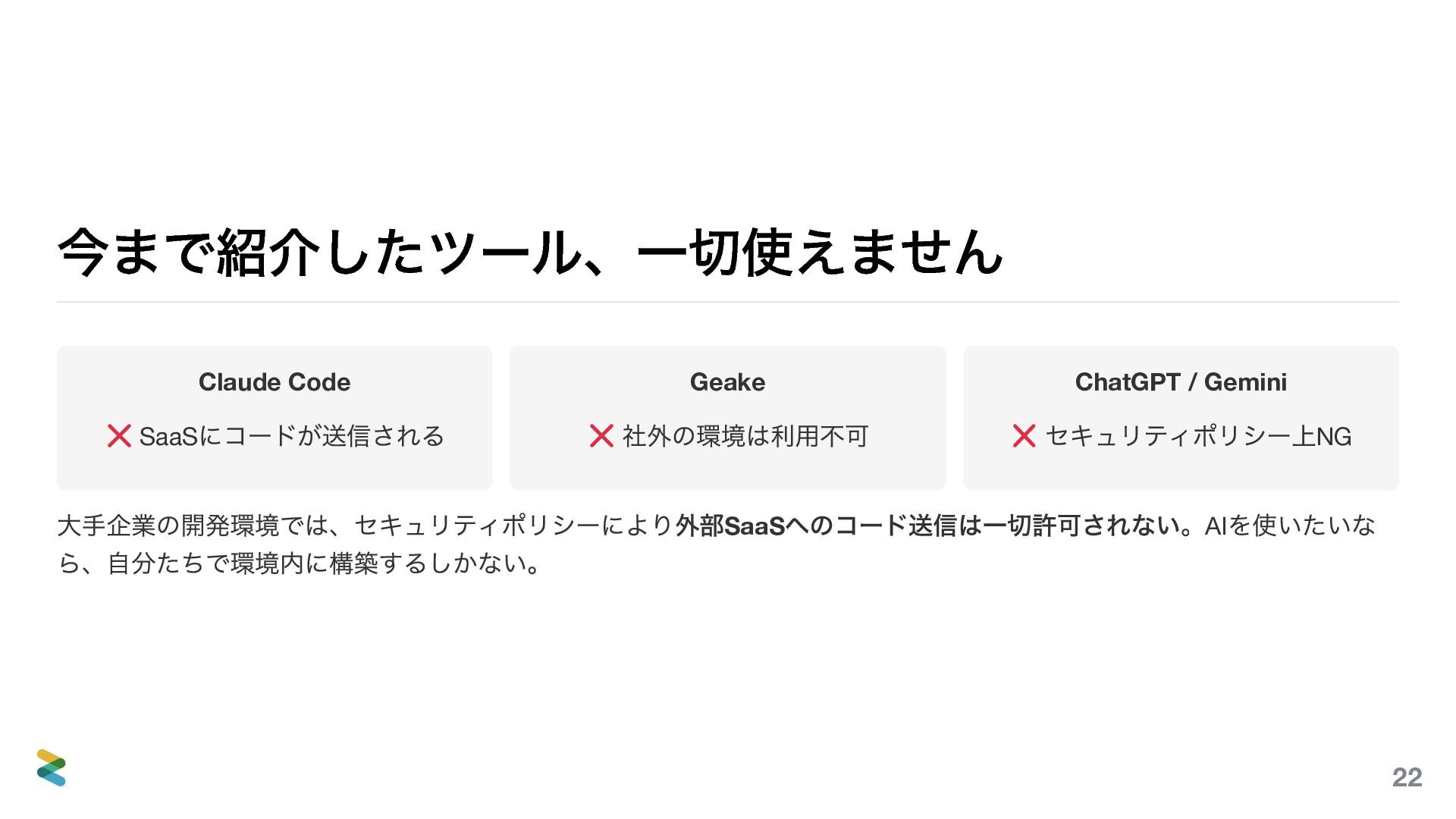 「AIを使っている」と一口に言っても、環境が変われば使えるツールも、作るべきものも、守るべき制約もまったく 違う。3つの例(開発ツール、自社プロダクト、顧客案件)を通して、自分の環境ではどう使うべきか? そのヒントになれば嬉しい。