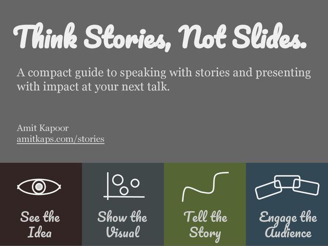 Crafting a talk that engages, inspires and connects with the audience requires time and effort. Plan for it. Here is a short guide to do so, in four sections ― See the Idea, Show the Visual, Tell the Story, and Engage the Audience. Read this guide and then start working on your talk. See the web version at http://amitkaps.com/stories and you can buy a pdf version, if you want from there.
