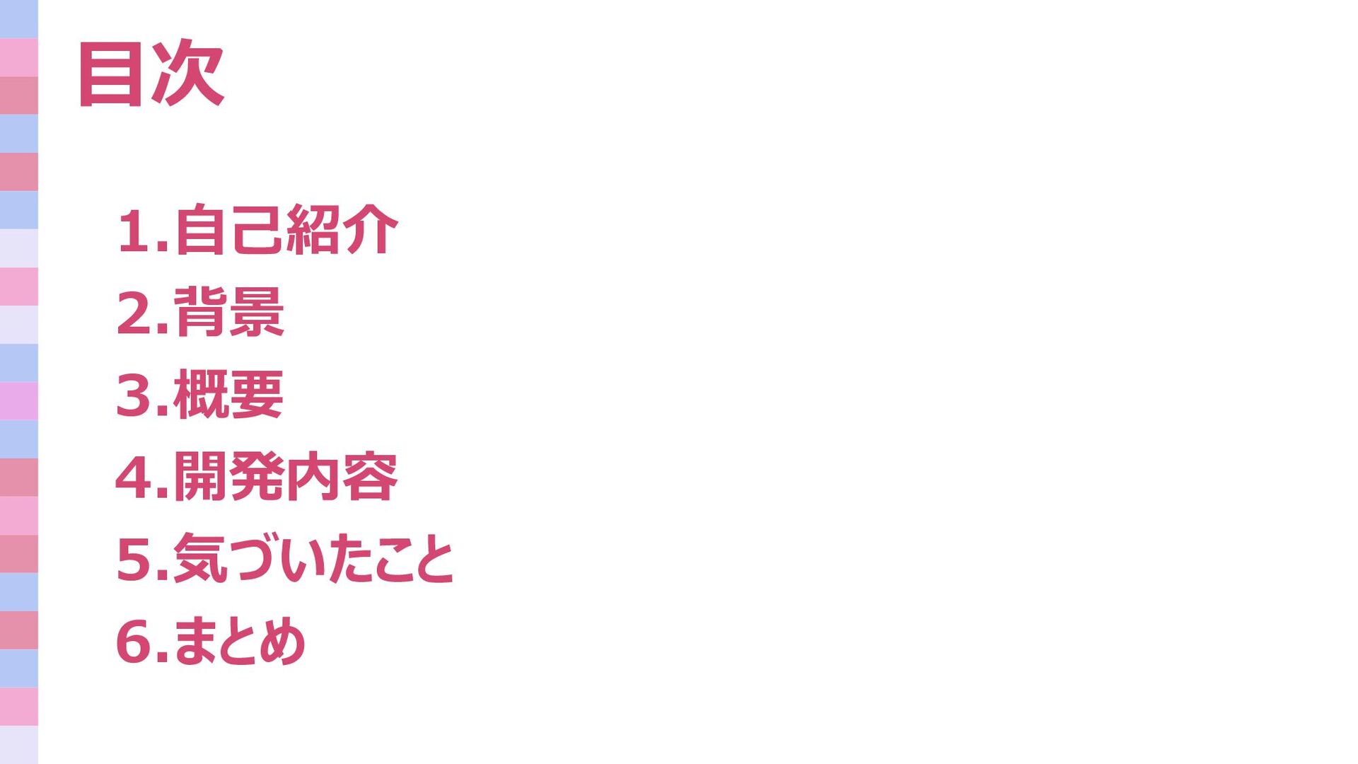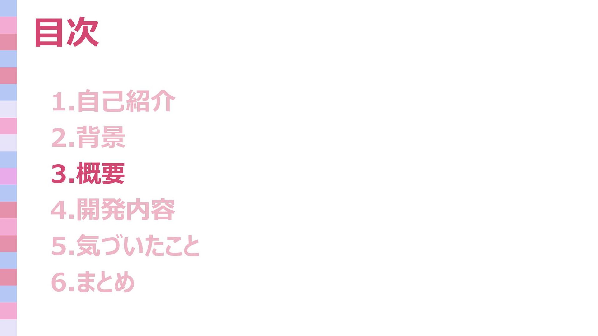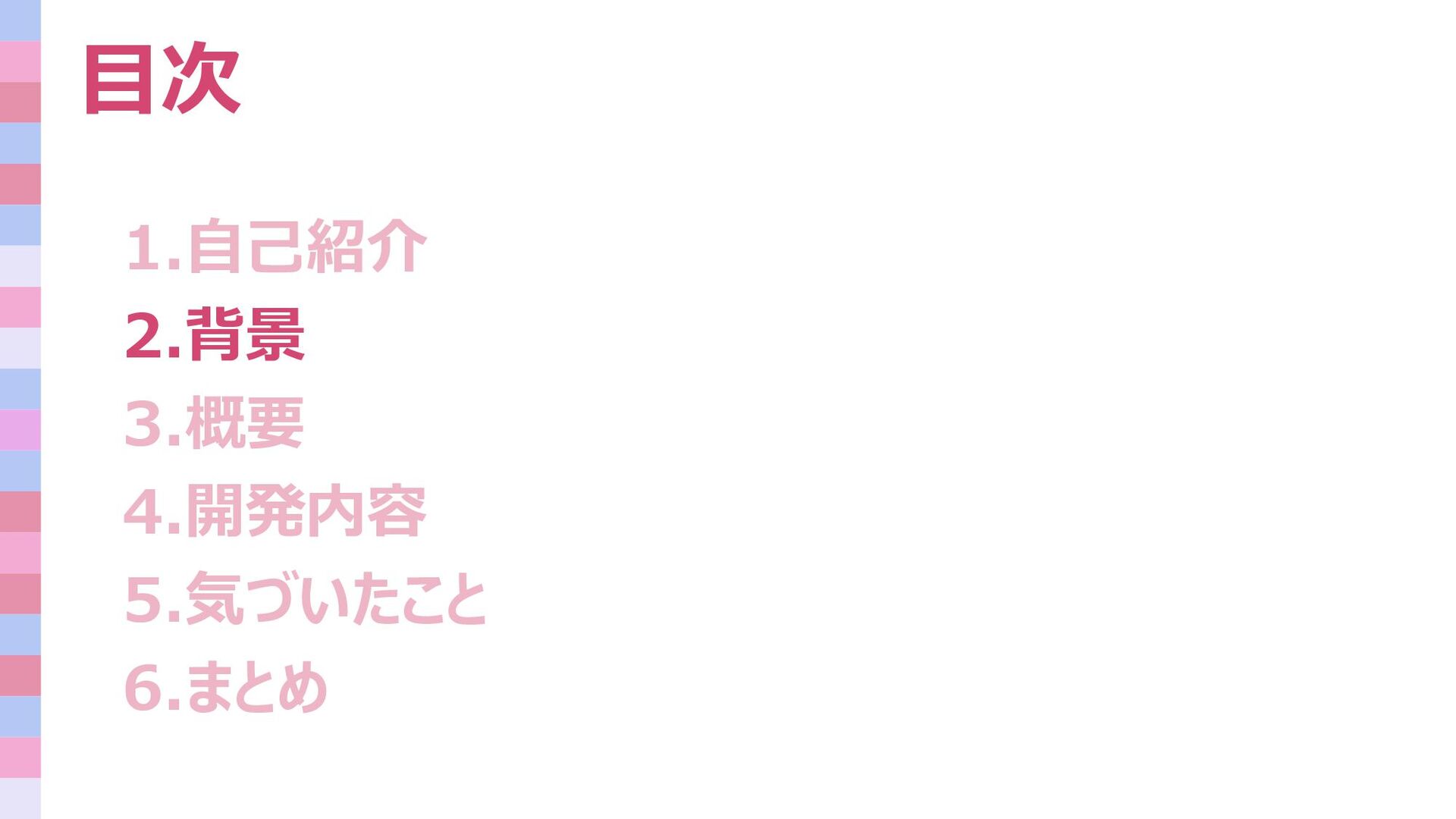 目次 1.自己紹介 2.背景 3.概要 4.開発内容 5.気づいたこと 6.まとめ