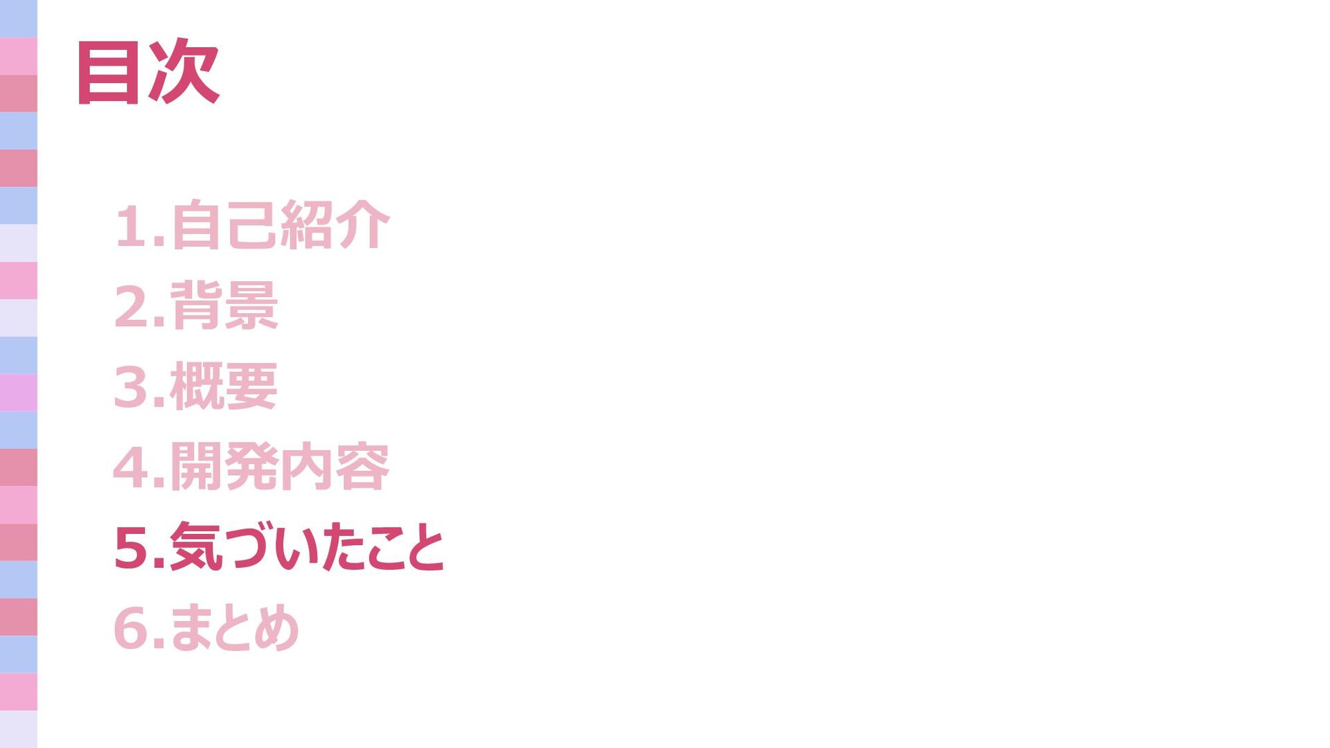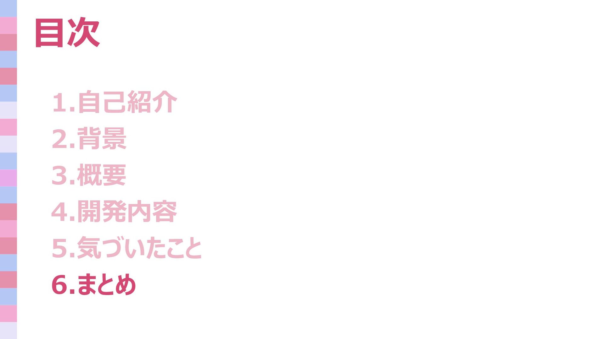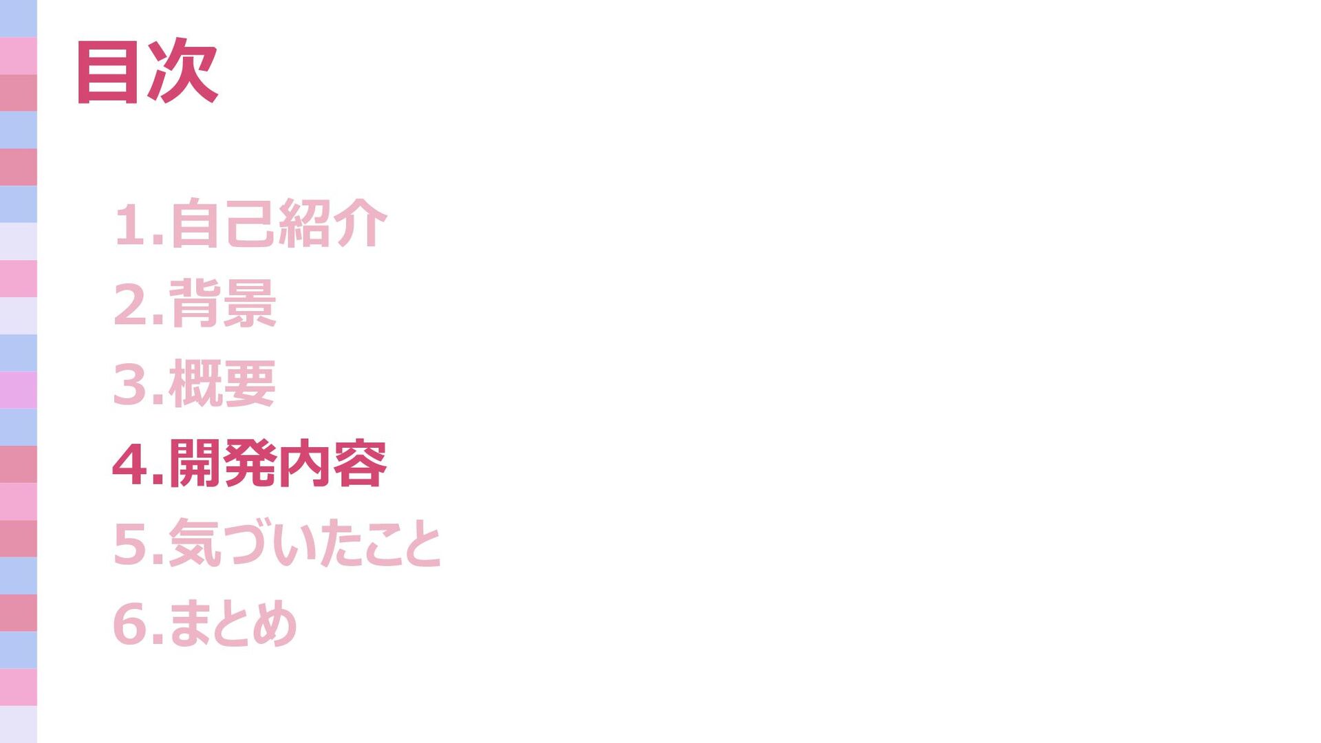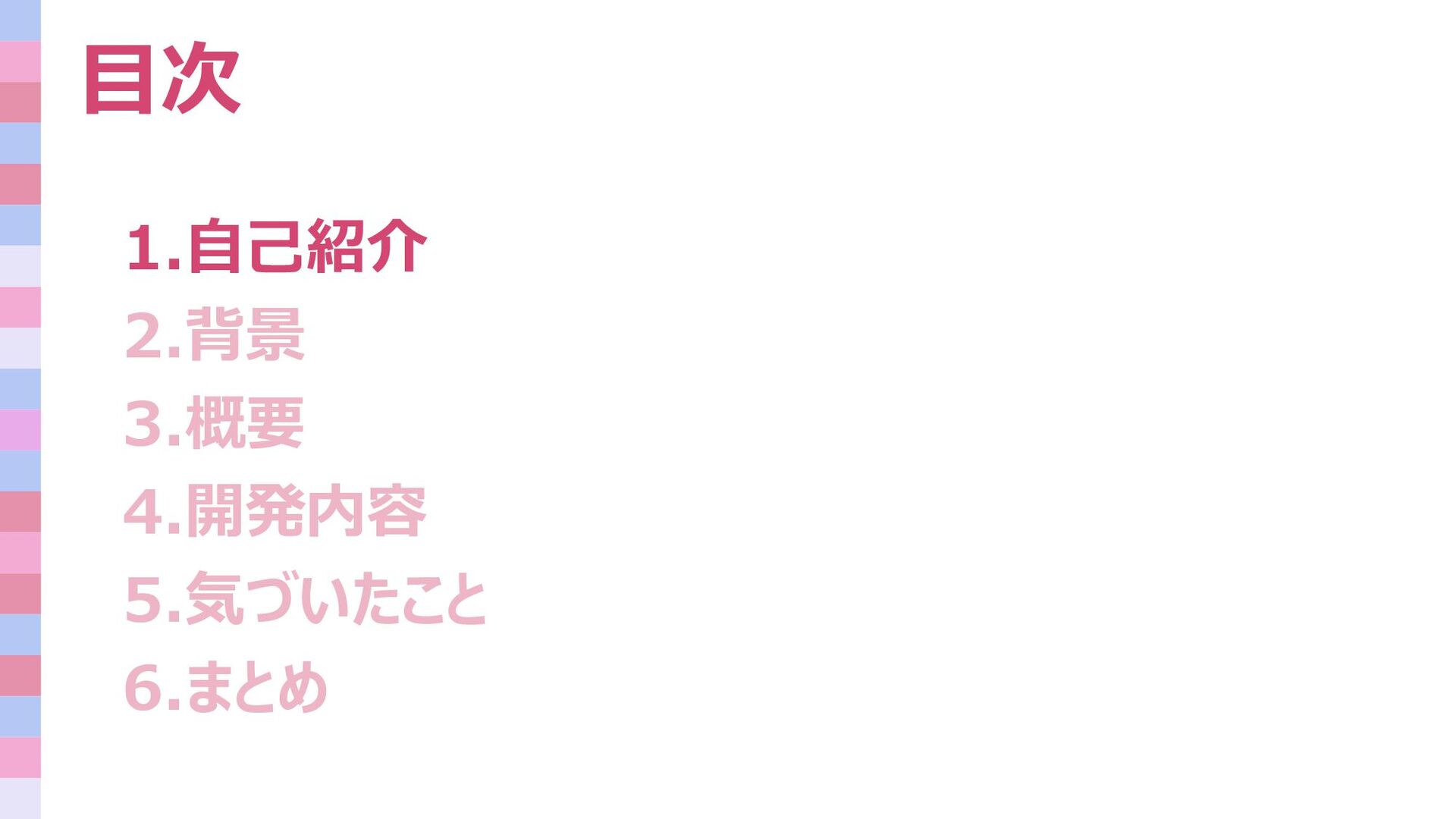 目次 1.自己紹介 2.背景 3.概要 4.開発内容 5.気づいたこと 6.まとめ