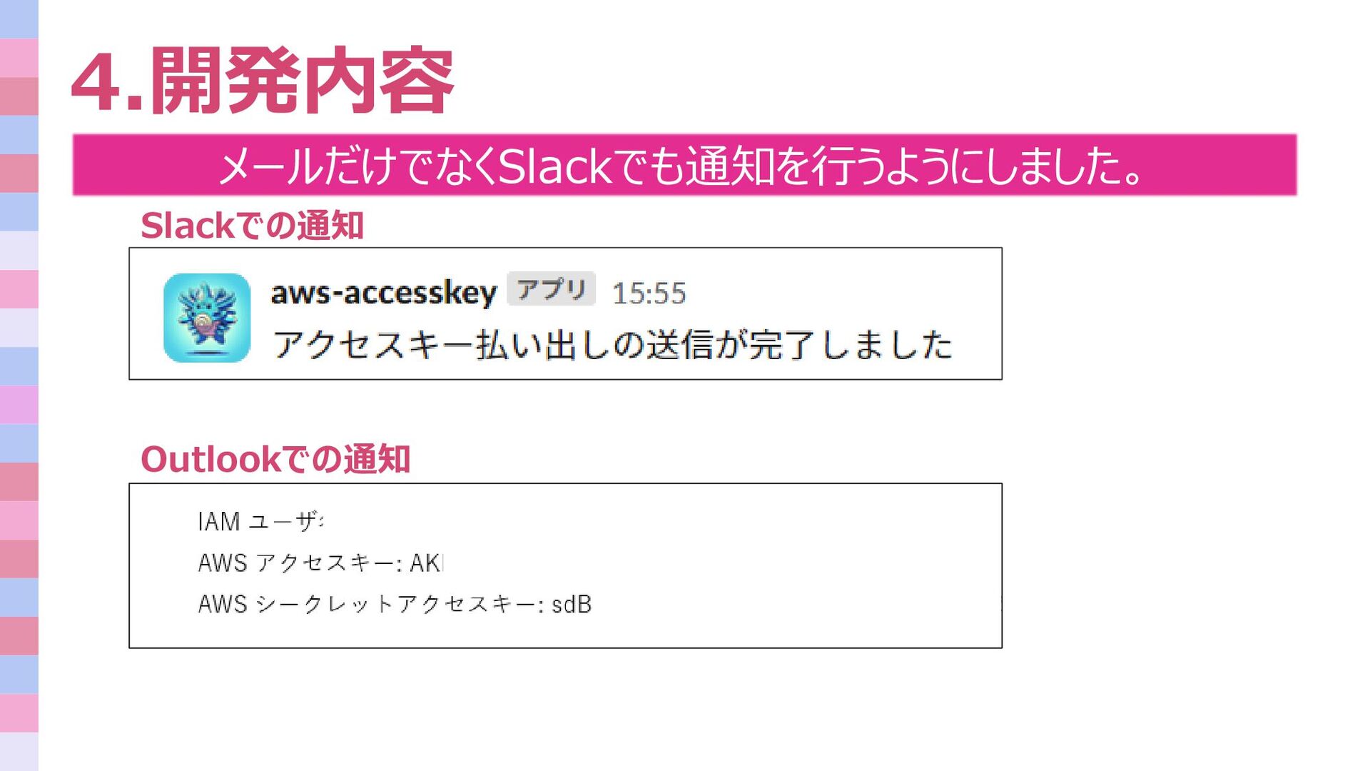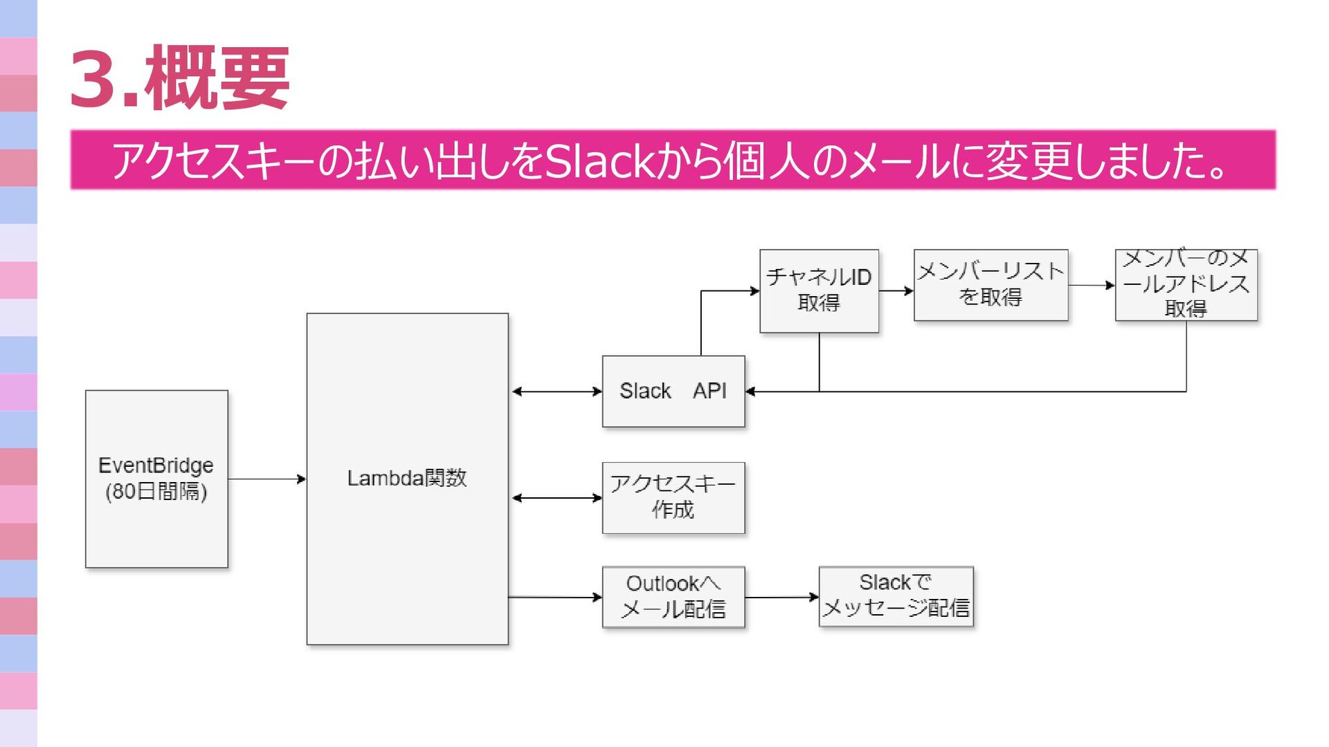 3.概要 アクセスキーの払い出しをSlackから個人のメールに変更しました。