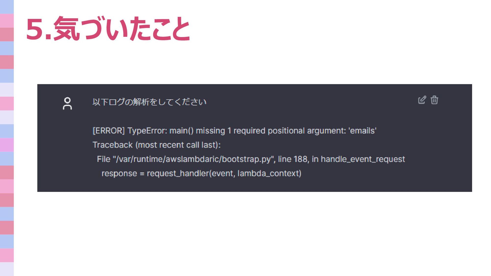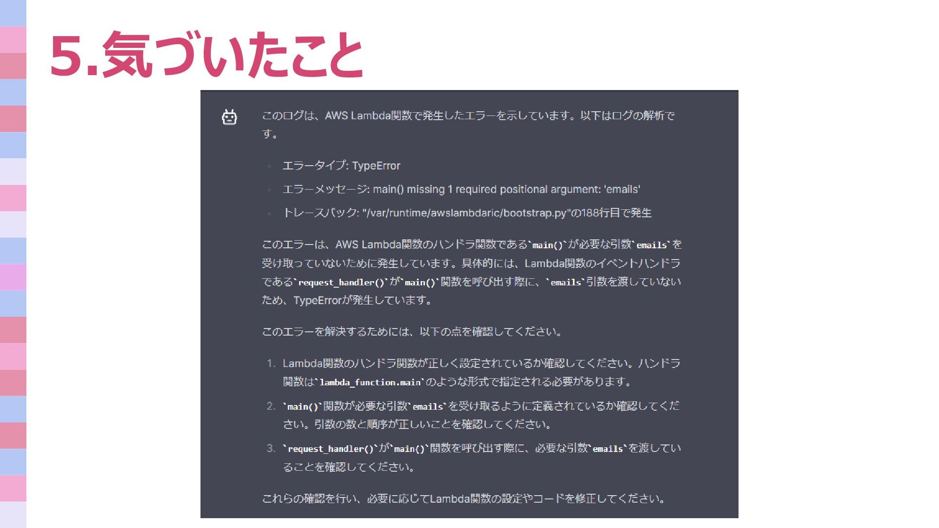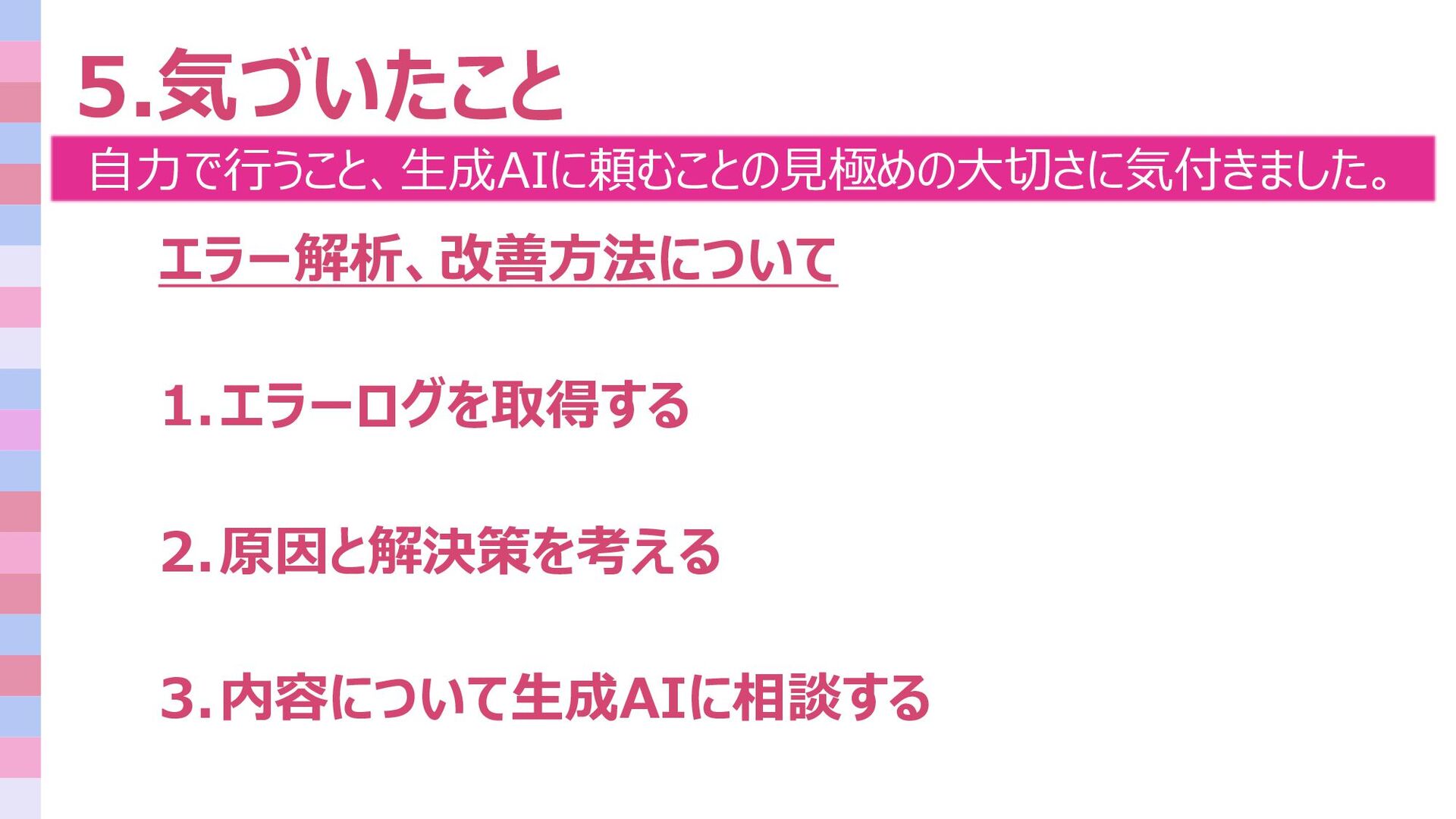 5.気づいたこと エラー解析、改善方法について 1.エラーログを取得する 2.原因と解決策を考える 3.内容について生成AIに相談する 自力で行うこと、生成AIに頼むことの見極めの大切さに気付きました。