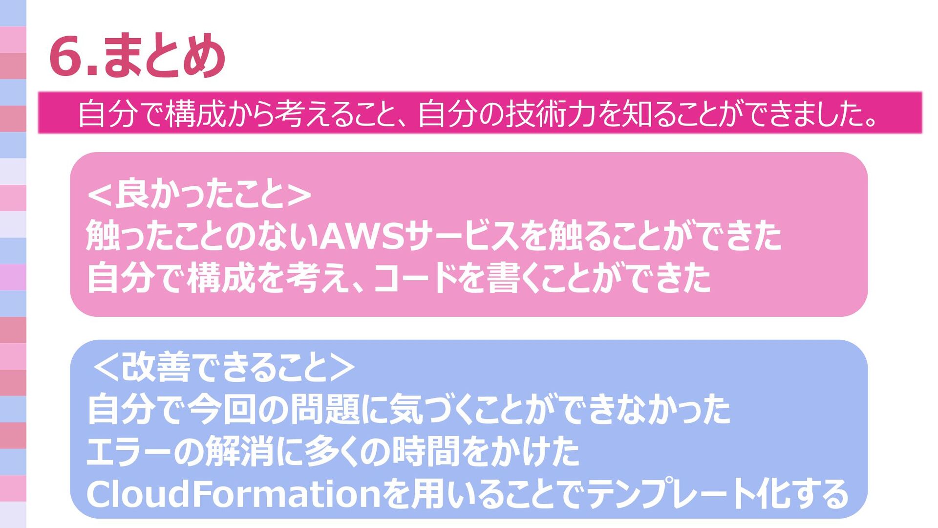 6.まとめ 自分で構成から考えること、自分の技術力を知ることができました。 <改善できること> 自分で今回の問題に気づくことができなかった エラーの解消に多くの時間をかけた CloudFormationを用いることでテンプレート化する <良かったこと> 触ったことのないAWSサービスを触ることができた 自分で構成を考え、コードを書くことができた