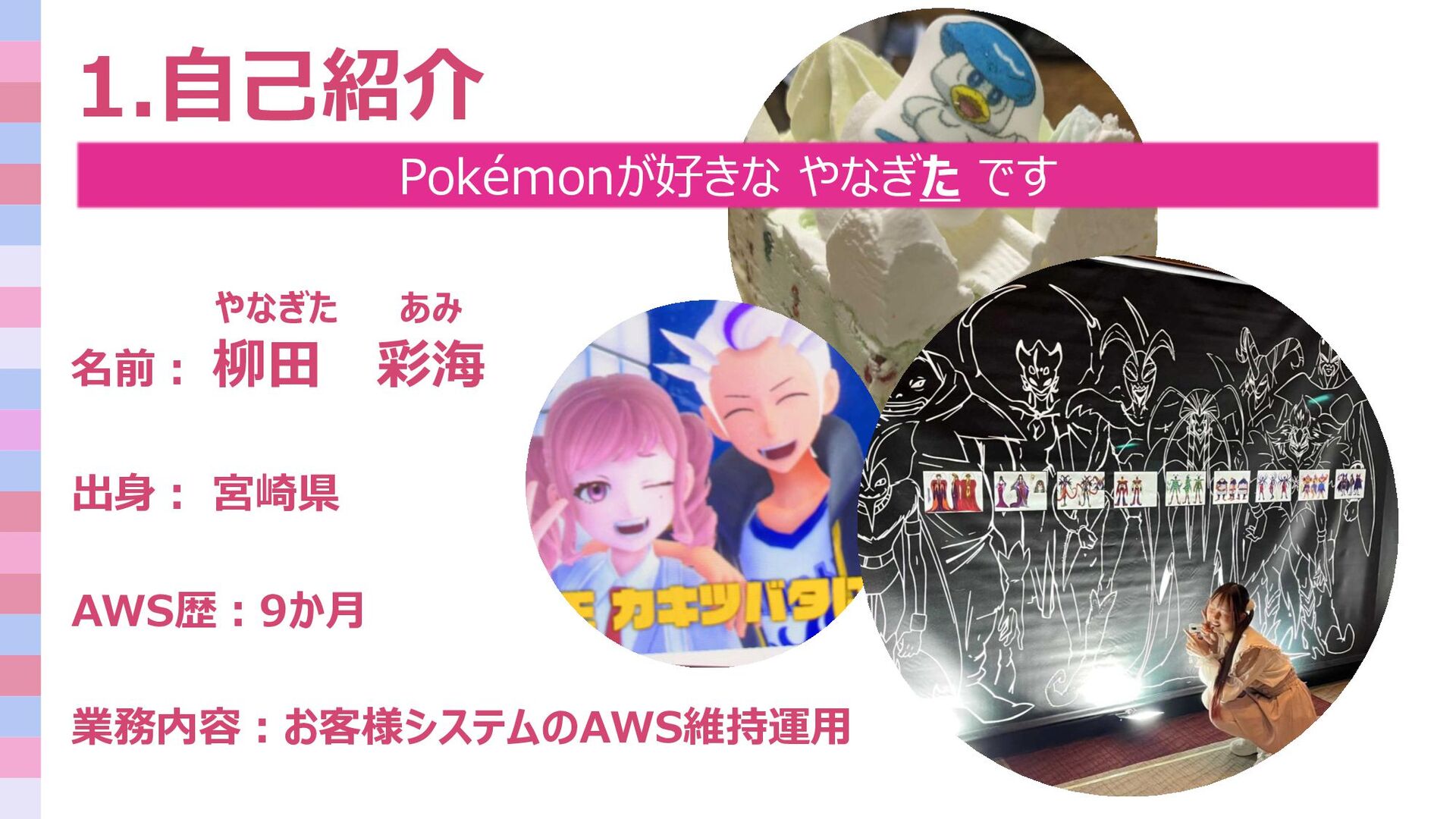 やなぎた あみ 1.自己紹介 名前: 柳田 彩海 出身: 宮崎県 AWS歴:9か月 業務内容:お客様システムのAWS維持運用