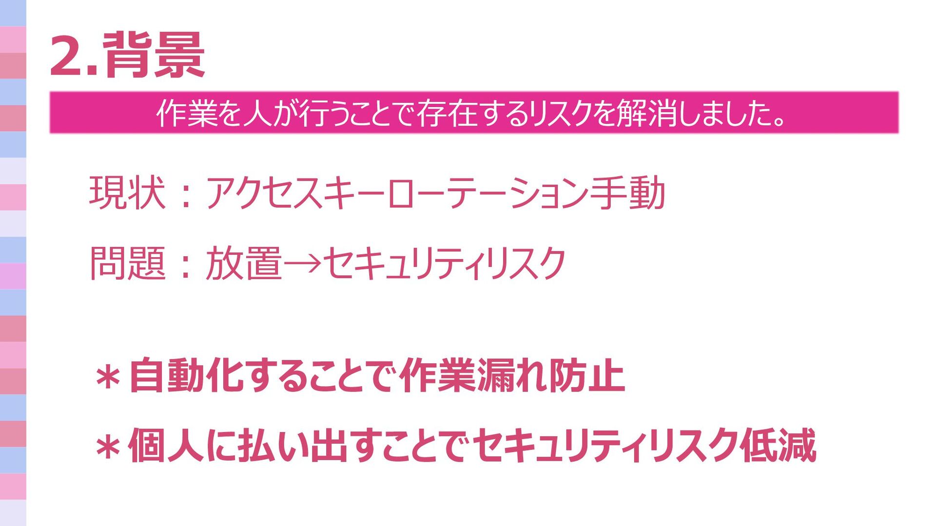 2.背景 作業を人が行うことで存在するリスクを解消しました。 現状:アクセスキーローテーション手動 問題:放置→セキュリティリスク *自動化することで作業漏れ防止 *個人に払い出すことでセキュリティリスク低減