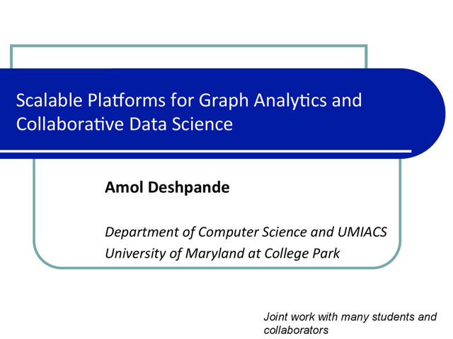 managing and analyzing big data by.. l Designing intui5ve, formal, and declara5ve abstrac5ons to empower users, and l Developing scalable pla)orms and algorithms to support those abstrac5ons over large volumes of data l Major research thrusts over the last 10 years l Uncertain and probabilis5c data management l Graph data management l Data management in the cloud l Collabora5ve data analy5cs l Query processing and op5miza5on Focus of Our Research at UMD