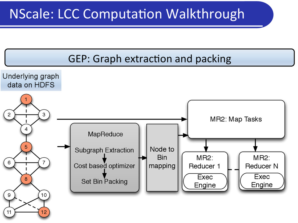 3 4 6 5 7 8 9 10 11 12 Underlying graph data on HDFS Specifying Computation: BluePrints API Program cannot be executed as is in vertex-centric programming frameworks.