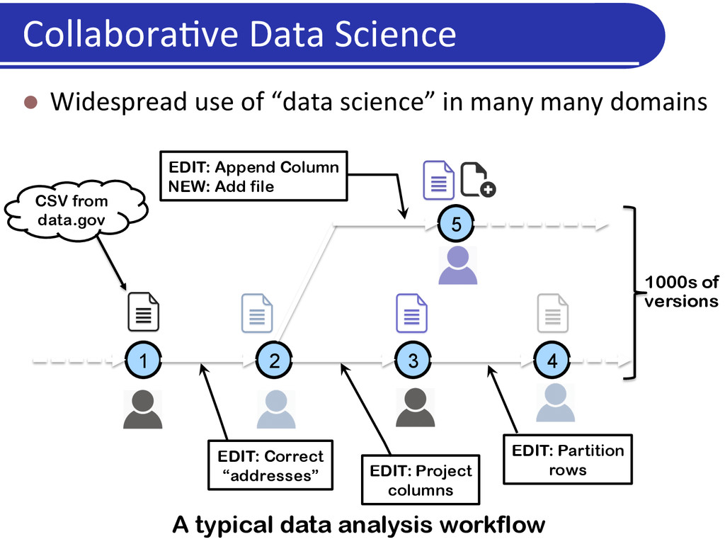 in many many domains 1 2 3 4 5 CSV from data.gov EDIT: Correct “addresses” EDIT: Append Column NEW: Add file EDIT: Project columns EDIT: Partition rows A typical data analysis workflow 1000s of versions