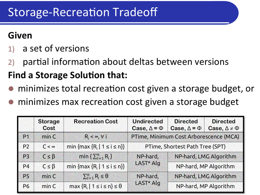 2) par5al informa5on about deltas between versions Find a Storage SoluDon that: l minimizes total recrea5on cost given a storage budget, or l minimizes max recrea5on cost given a storage budget
