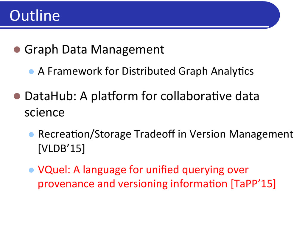 Graph Analy5cs l DataHub: A pla)orm for collabora5ve data science l Recrea5on/Storage Tradeoff in Version Management [VLDB’15] l VQuel: A language for unified querying over provenance and versioning informa5on [TaPP’15] Outline