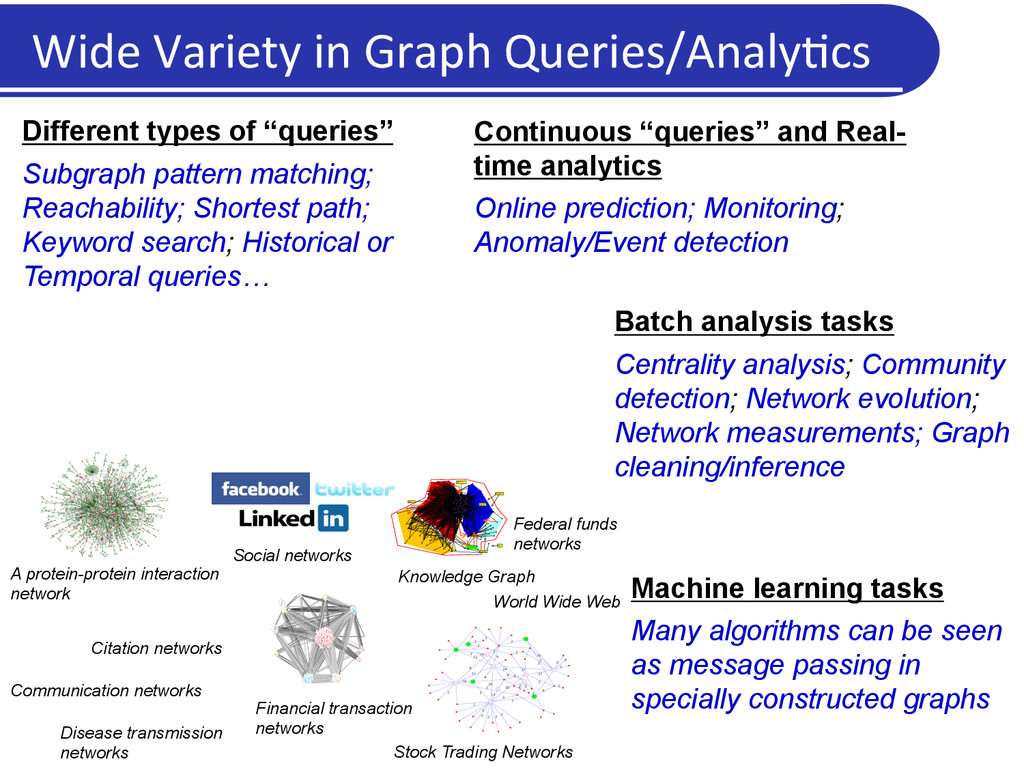 prior and ongoing work – most of it outside, or on top of, general-‐purpose data management systems l Specialized indexes or algorithms for specific types of queries l Stand-‐alone prototypes for specific analysis tasks l Emergence of specialized graph databases in recent years l Neo4j, Titan, OrientDB, DEX, AllegroGraph, … l Rudimentary declara5ve interfaces/query languages l Several “vertex-‐centric” frameworks in recent years l Pregel, Giraph, GraphLab, GRACE, GraphX, … l Only work well for a very limited set of tasks l Li?le work on con5nuous/real-‐5me query processing, or on suppor5ng evolu5onary or temporal analy5cs