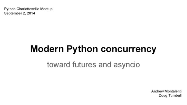 What is concurrency? Is Python good at it? How to scale up from single-node concurrency to multi-node. What does Python's new concurrent.futures stdlib library give us? What does asyncio give us? How do we evaluate concurrent performance?