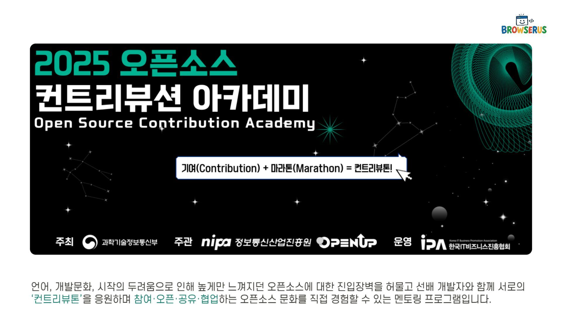 아직 오픈소스 프로젝트에 익숙하지 않은 예비/초급 개발자 대상 • 협업도구 git 심화과정 멘토링 2주 • 분야별 오픈소스 프로젝트 활용 실습 멘토링 4주 • 참여형 13주 • 오픈소스 기본 역량을 갖춘 예비/초급 개발자 대상 • Challenges 4주 : 컨트리뷰션 시작을 위한 환경세팅 및 이슈선정 등의 온보딩 기간 • Masters 9주 : Challenges 를 수료한 멘티가 주도적으로 컨트리뷰션 진행 • 성과공유회 발표 + 시상식
