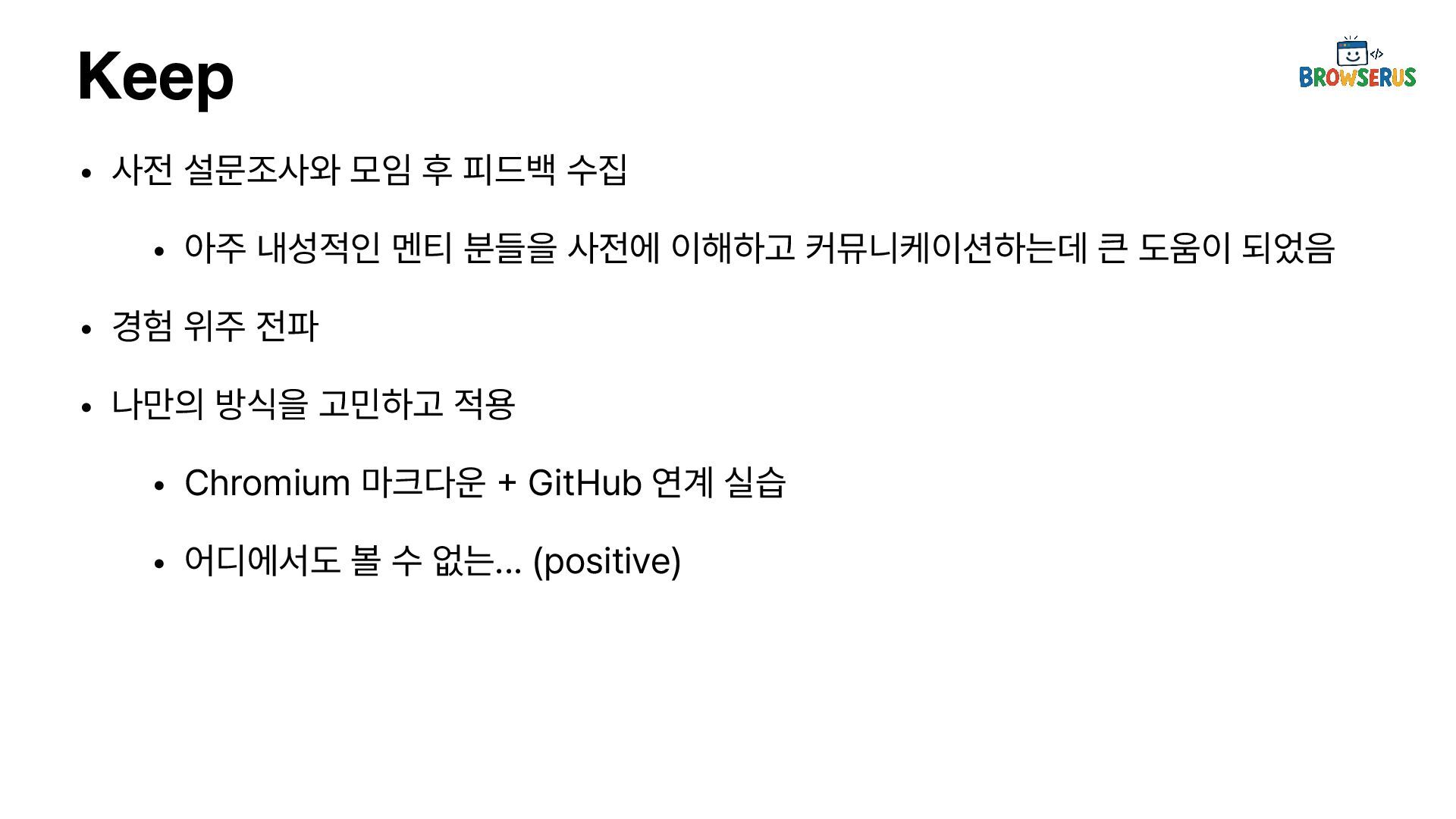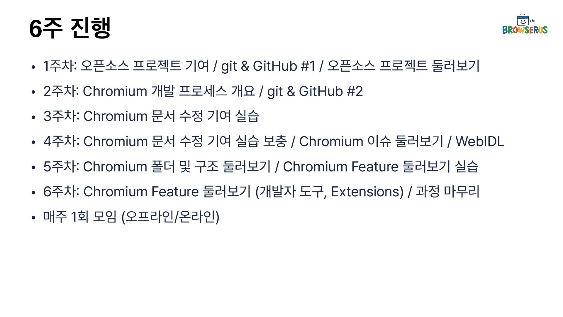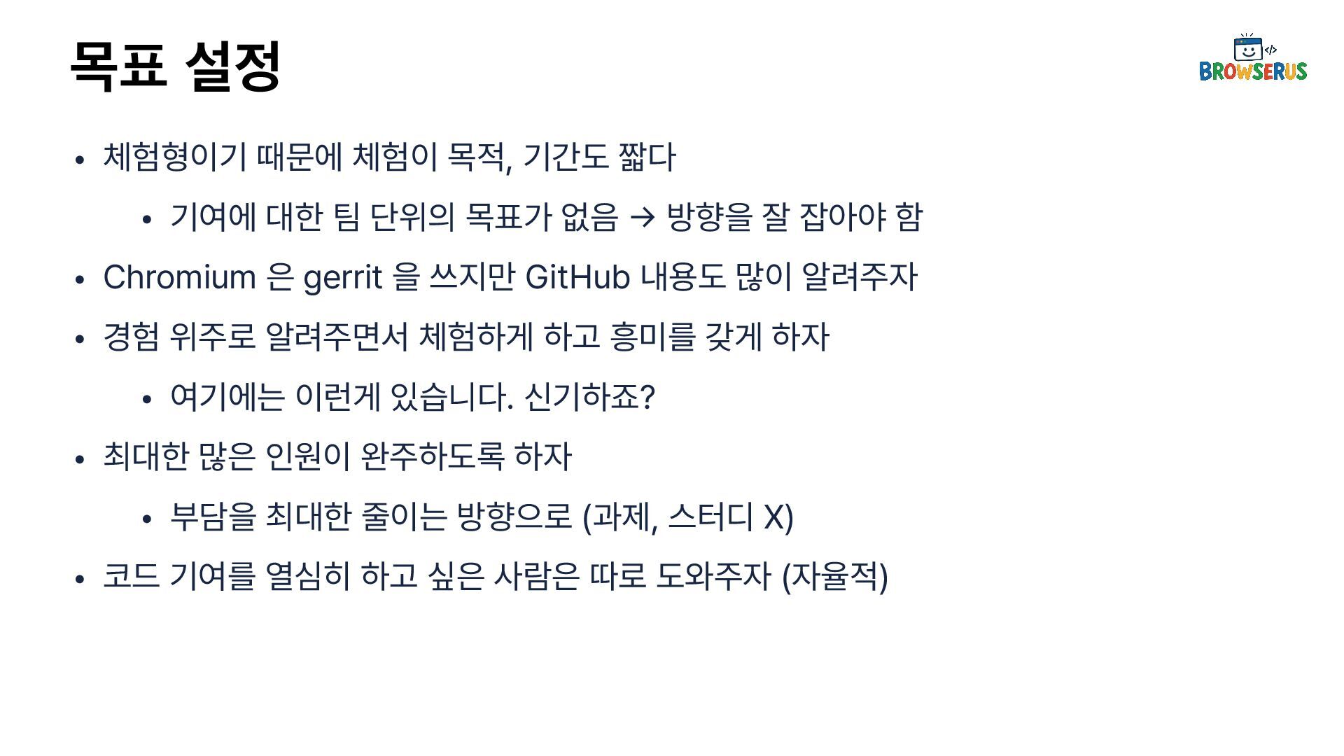 기여에 대한 팀 단위의 목표가 없음 -> 방향을 잘 잡아야 함 • Chromium 은 gerrit 을 쓰지만 GitHub 내용도 많이 알려주자 • 경험 위주로 알려주면서 체험하게 하고 흥미를 갖게 하자 • 여기에는 이런게 있습니다. 신기하죠? • 최대한 많은 인원이 완주하도록 하자 • 부담을 최대한 줄이는 방향으로 과제, 스터디 X • 코드 기여를 열심히 하고 싶은 사람은 따로 도와주자 자율적