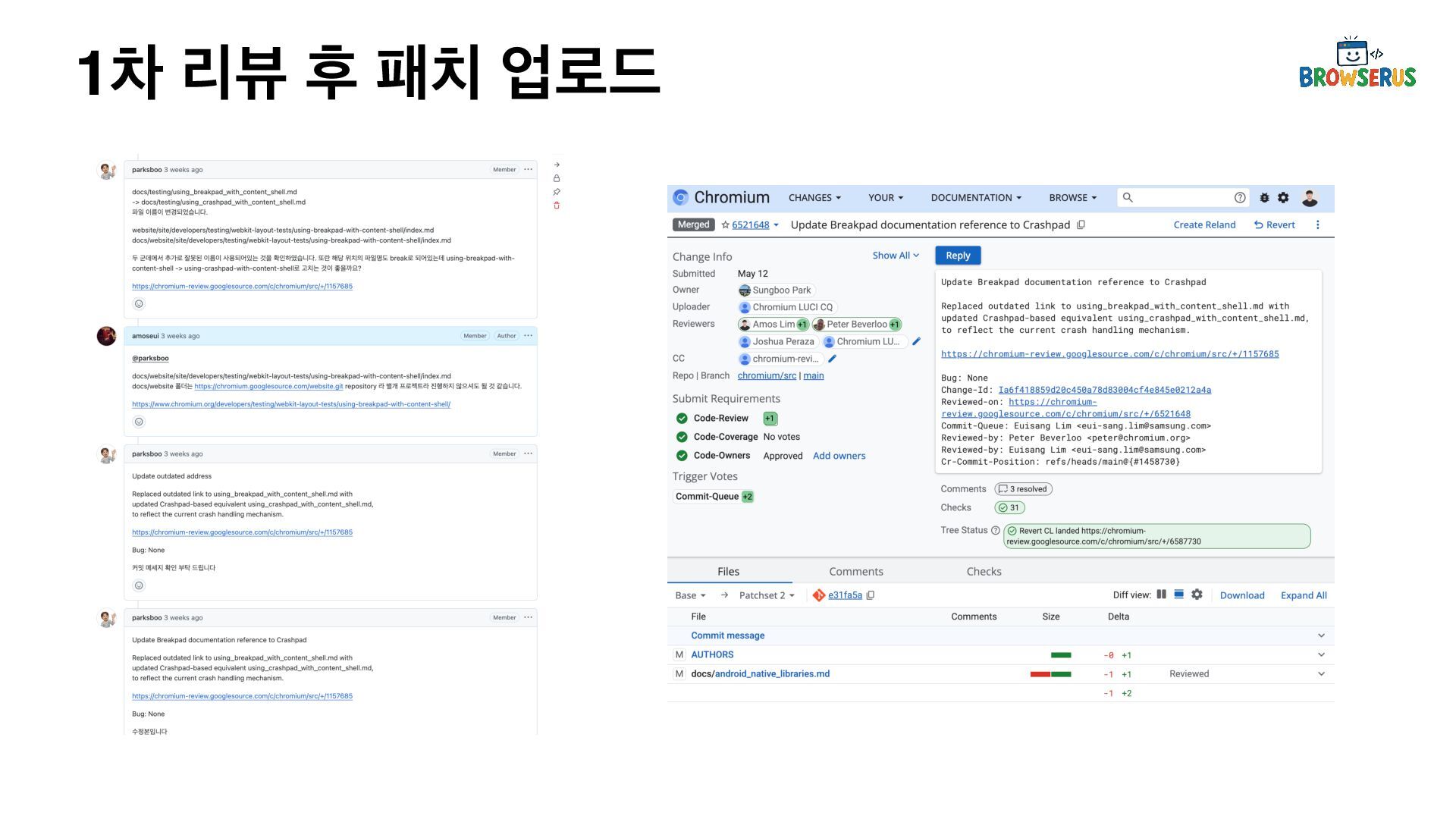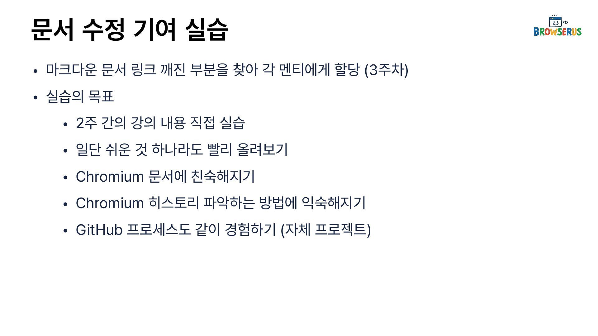 찾아 각 멘티에게 할당 3주차 • 실습의 목표 • 2주 간의 강의 내용 직접 실습 • 일단 쉬운 것 하나라도 빨리 올려보기 • Chromium 문서에 친숙해지기 • Chromium 히스토리 파악하는 방법에 익숙해지기 • GitHub 프로세스도 같이 경험하기 자체 프로젝트