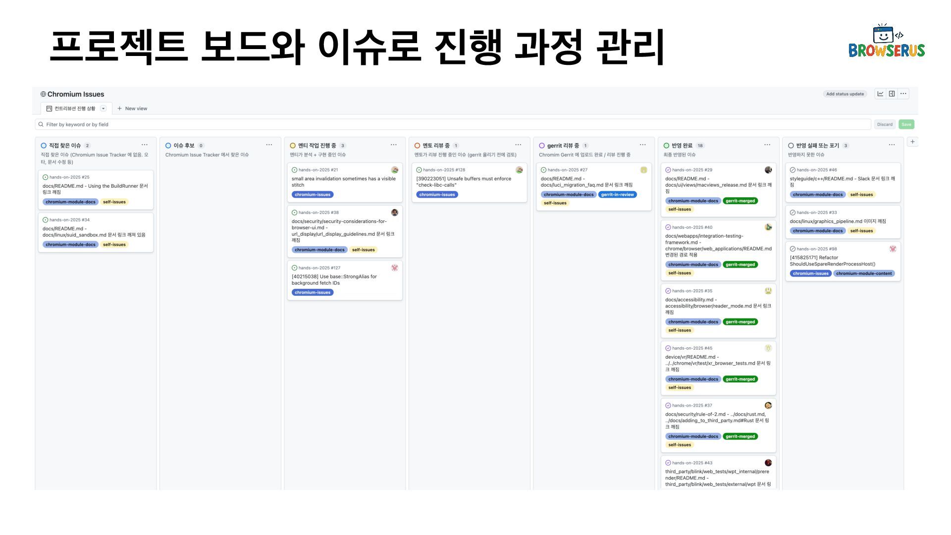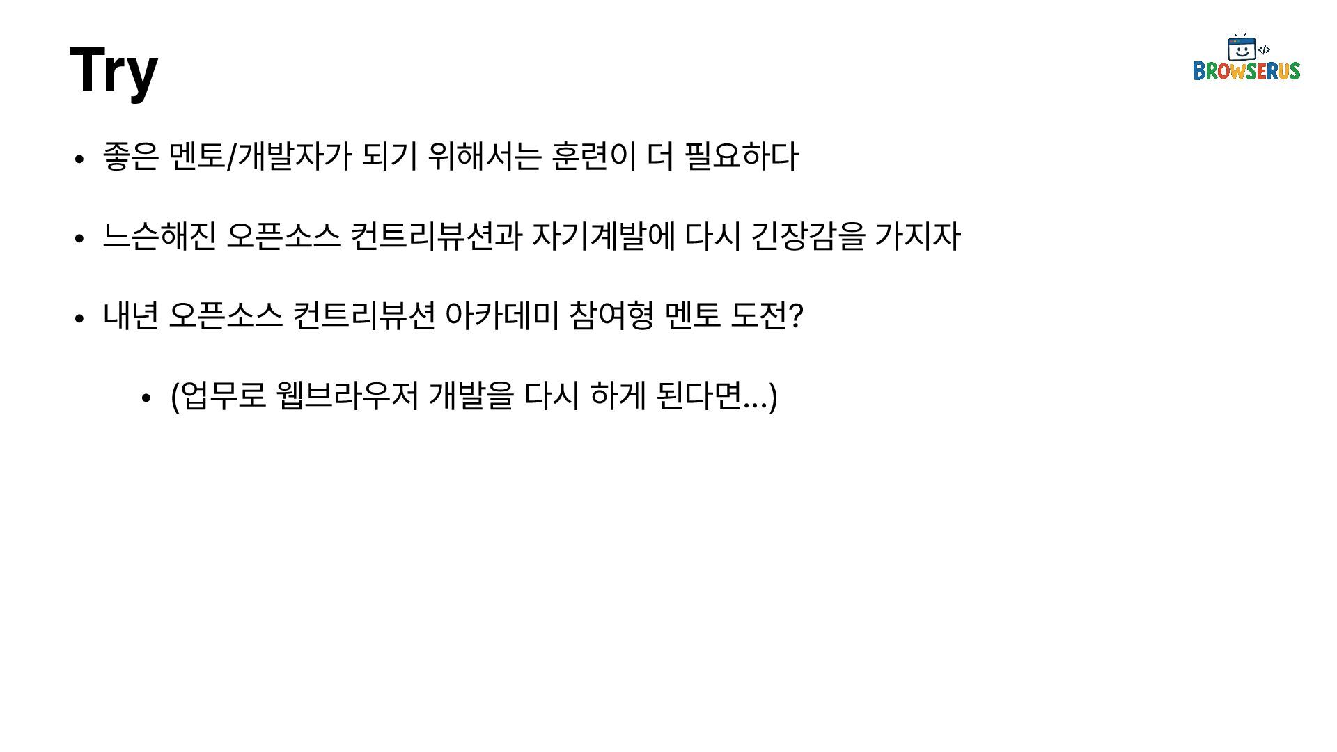 • git, GitHub, 협업, 유닛 테스트, 터미널 환경 등에 익숙해지기 • 오픈소스 컨트리뷰션에 대한 심리적인 장벽 두려움 을 낮추기 • 오픈소스 개발 프로세스를 직접 체험해보기 • Chromium 에 간단한 패치라도 반영해보기 • 관심있는 다른 오픈소스 프로젝트에도 적용해보기 • 멘토, 다른 멘티들과 친분 쌓기 • 뚜렷한 목표를 세워보세요. • 각자의 상황과 경력, 전문 분야에 따라…