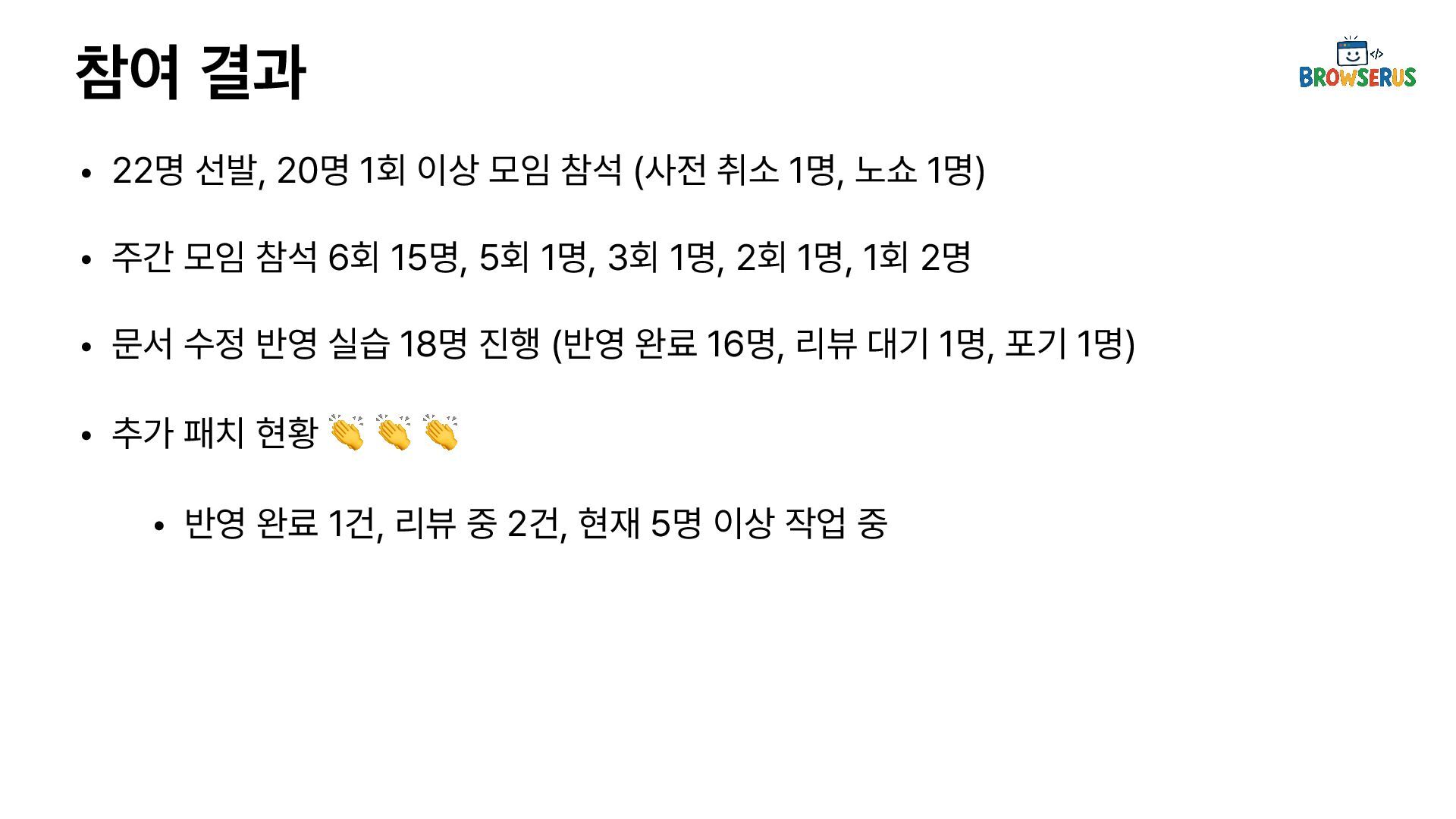 사전 취소 1명, 노쇼 1명 • 주간 모임 참석 6회 15명, 5회 1명, 3회 1명, 2회 1명, 1회 2명 • 문서 수정 반영 실습 18명 진행 반영 완료 16명, 리뷰 대기 1명, 포기 1명 • 추가 패치 현황 👏 👏 👏 • 반영 완료 1건, 리뷰 중 2건, 현재 5명 이상 작업 중