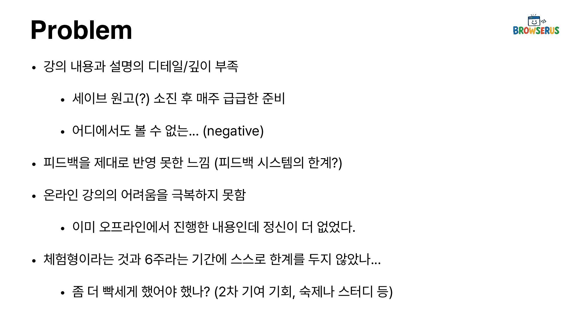 ? 소진 후 매주 급급한 준비 • 어디에서도 볼 수 없는... negative • 피드백을 제대로 반영 못한 느낌 피드백 시스템의 한계? • 온라인 강의의 어려움을 극복하지 못함 • 이미 오프라인에서 진행한 내용인데 정신이 더 없었다. • 체험형이라는 것과 6주라는 기간에 스스로 한계를 두지 않았나... • 좀 더 빡세게 했어야 했나? 2차 기여 기회, 숙제나 스터디 등