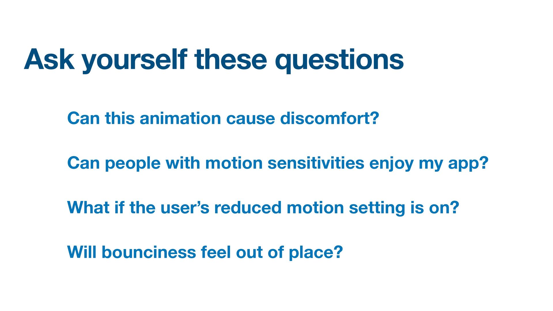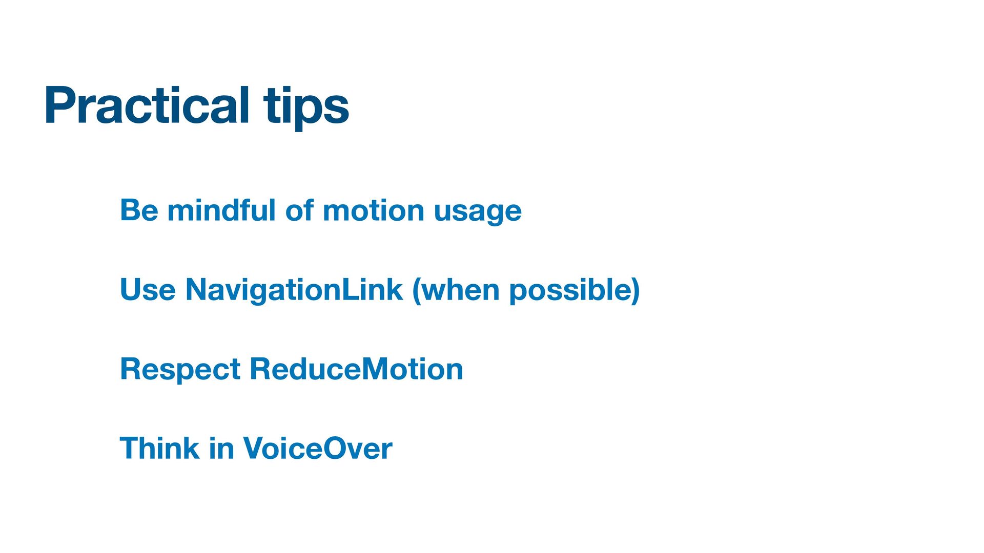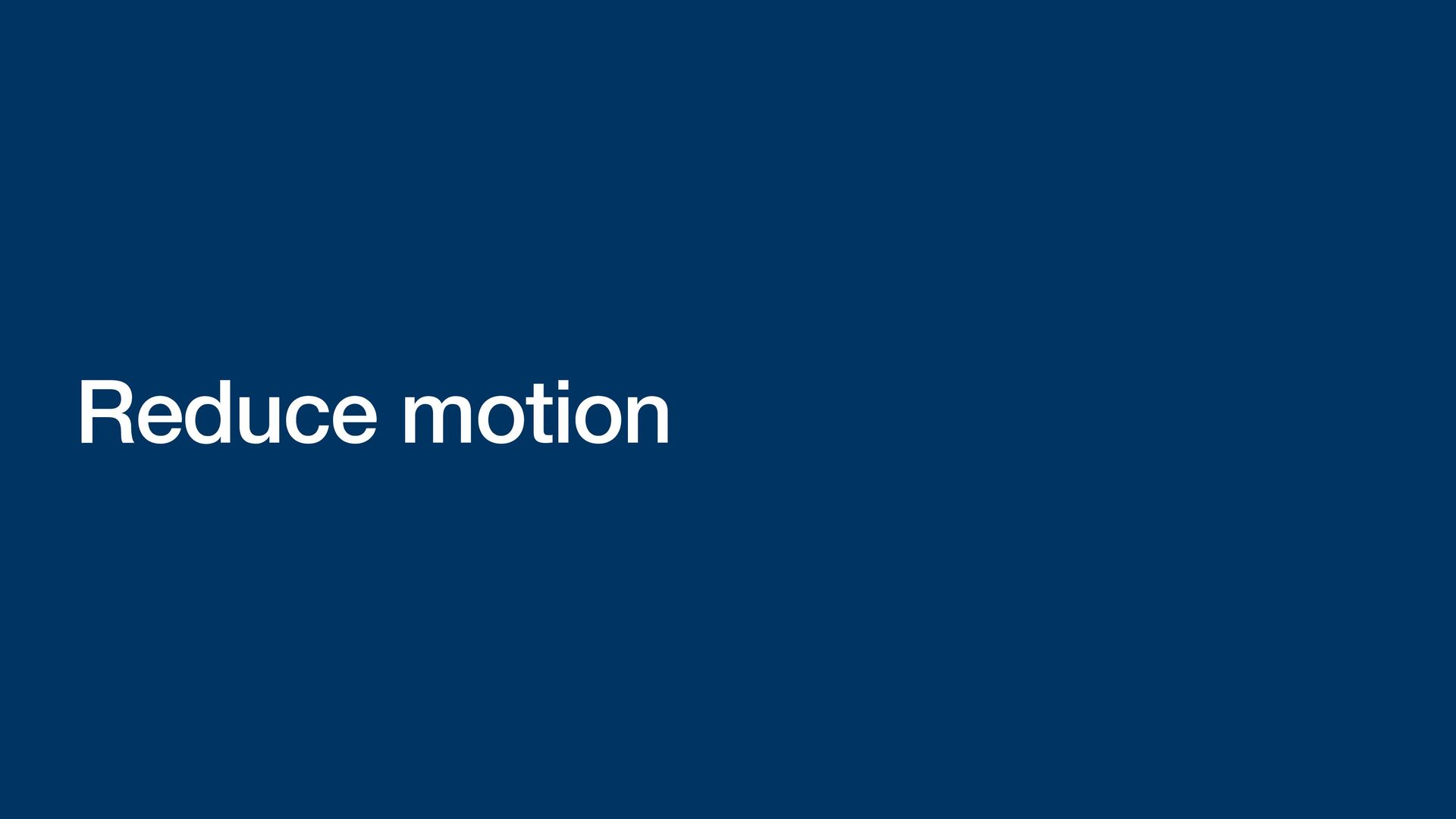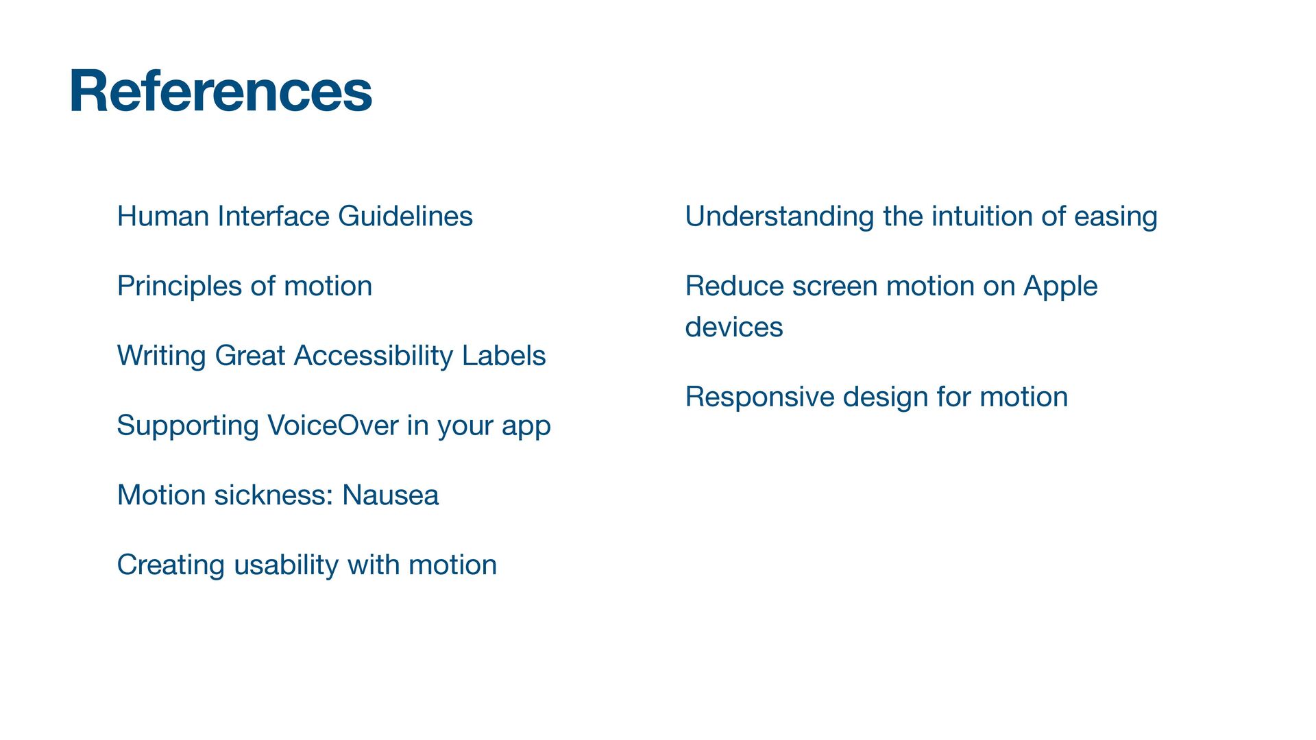 Labels Supporting VoiceOver in your app Motion sickness: Nausea Creating usability with motion Understanding the intuition of easing Reduce screen motion on Apple devices Responsive design for motion