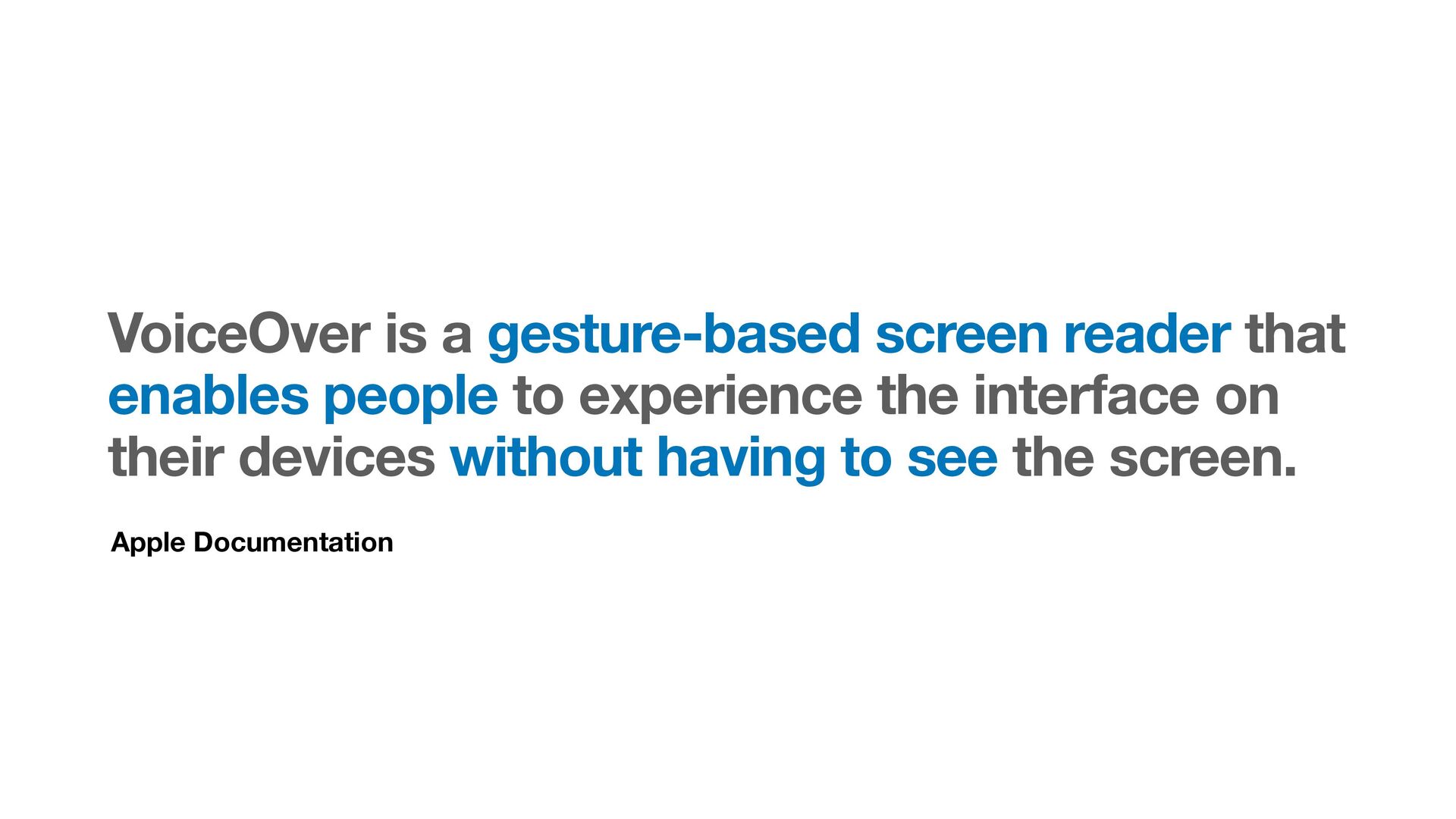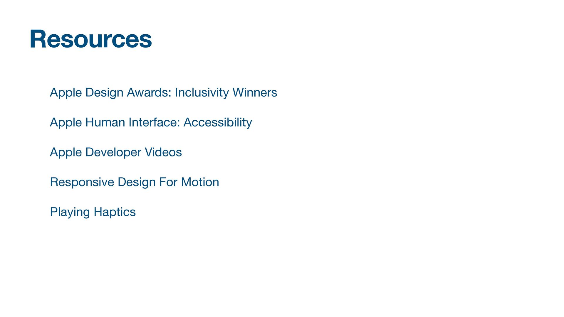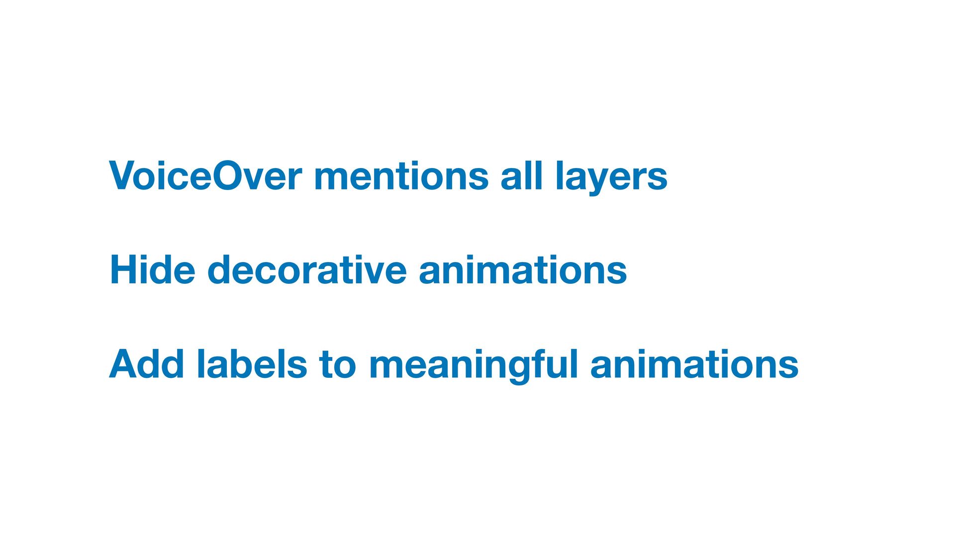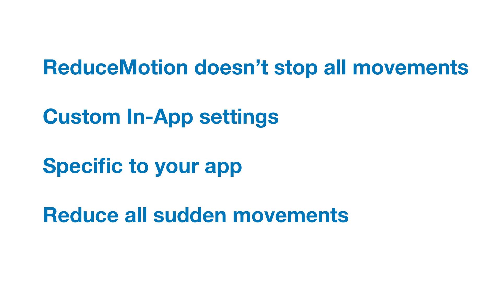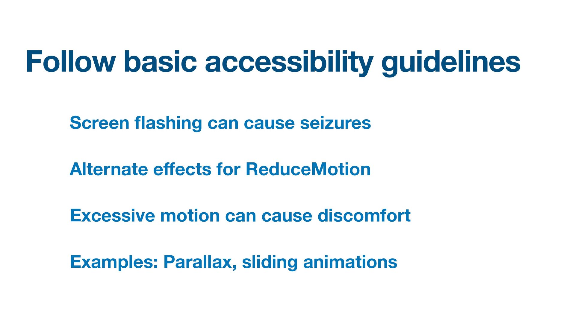 Labels Supporting VoiceOver in your app Motion sickness: Nausea Creating usability with motion Understanding the intuition of easing Reduce screen motion on Apple devices Responsive design for motion