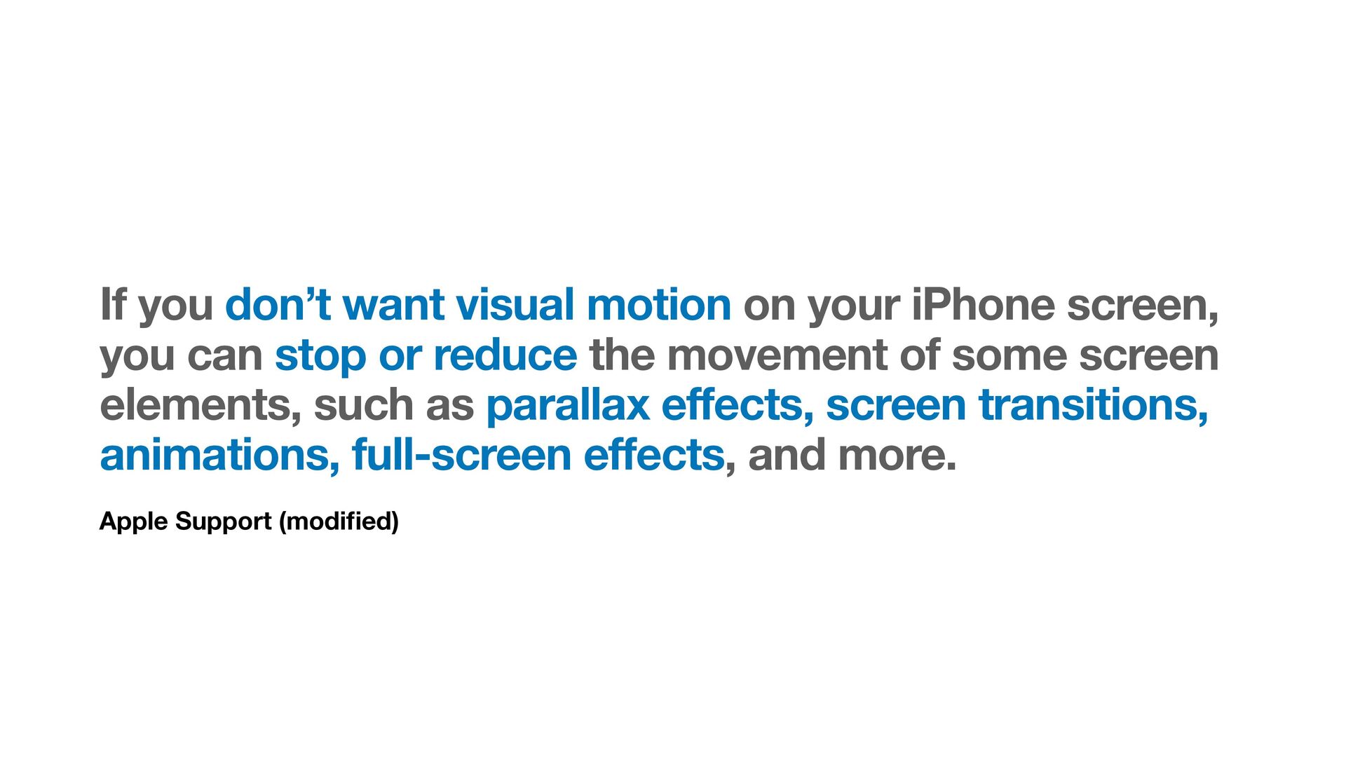 motion on your iPhone screen, you can stop or reduce the movement of some screen elements, such as parallax effects, screen transitions, animations, full-screen effects, and more.