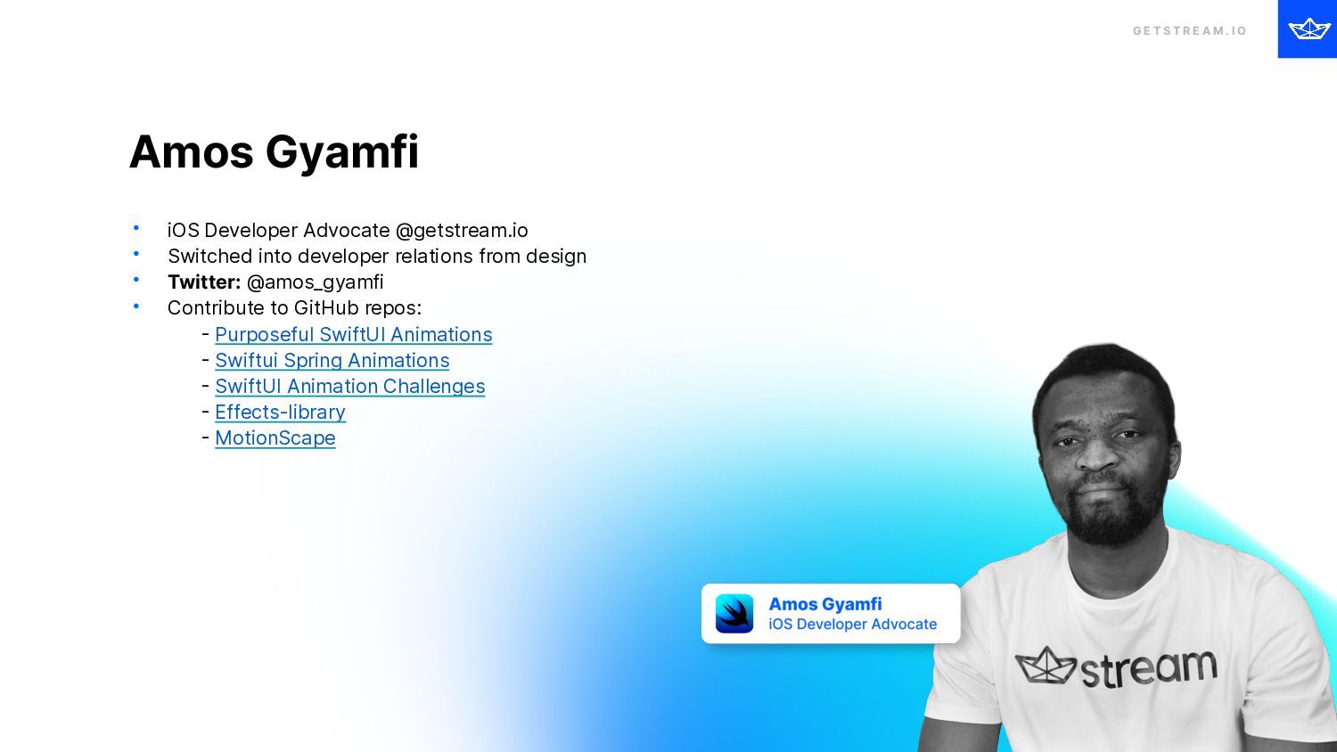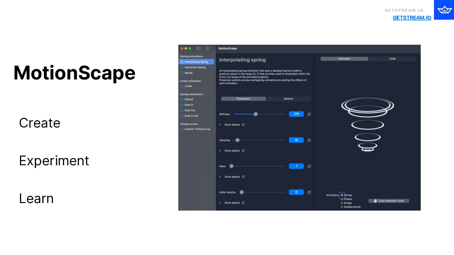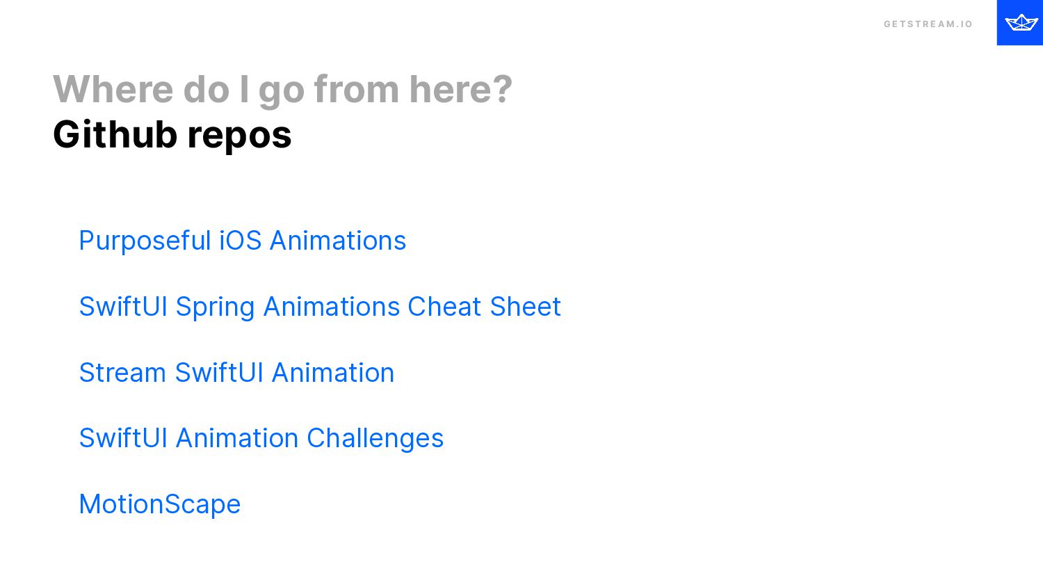 I O Where do I go from here? Github repos Purposeful iOS Animations SwiftUI Spring Animations Cheat Sheet Stream SwiftUI Animation SwiftUI Animation Challenges MotionScape