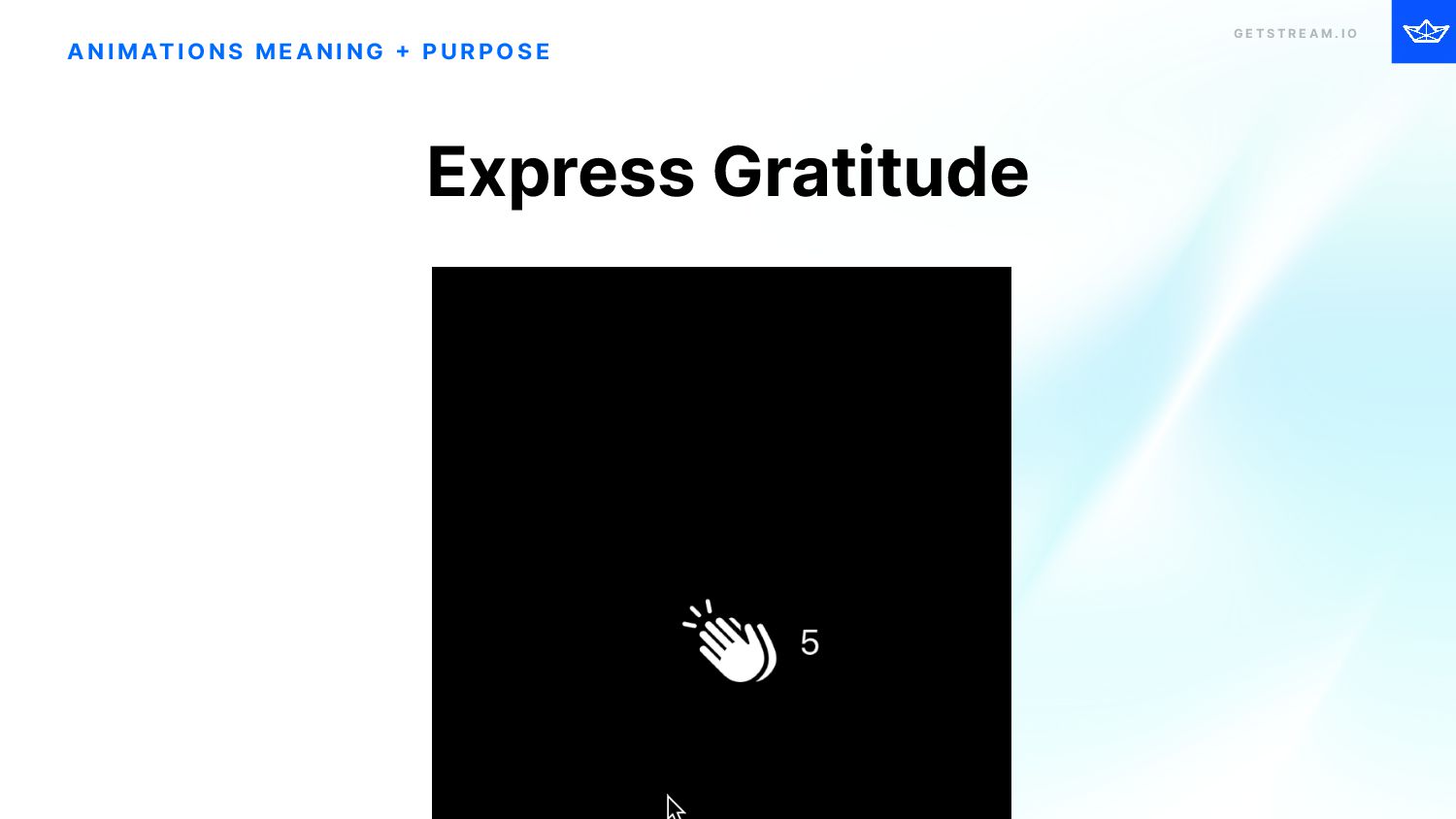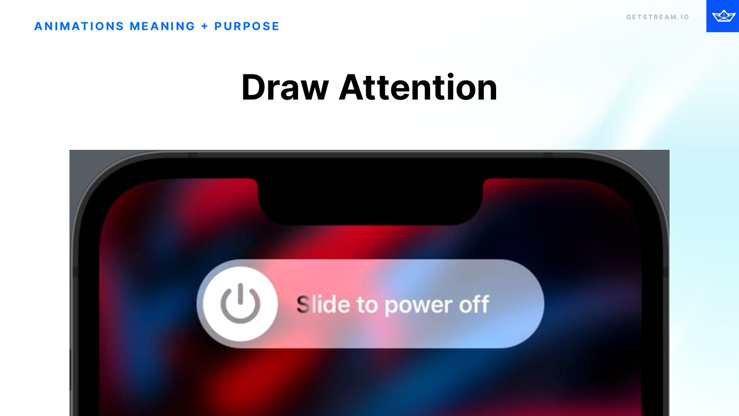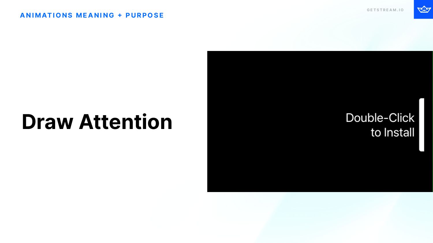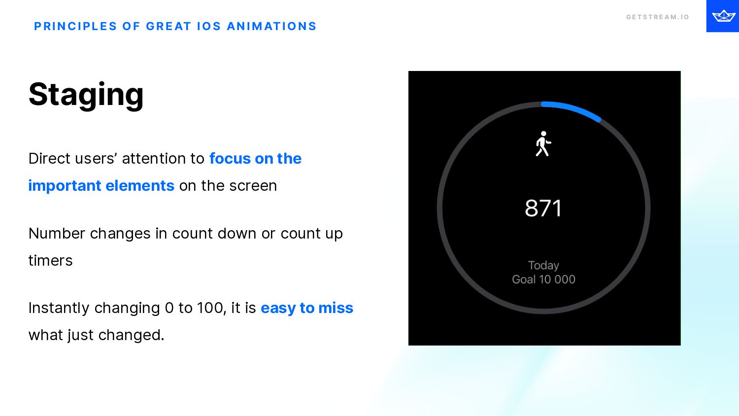 I O P R I N C I P L E S O F G R E AT I O S A N I M AT I O N S Staging Direct users’ attention to focus on the important elements on the screen Number changes in count down or count up timers Instantly changing 0 to 100, it is easy to miss what just changed.