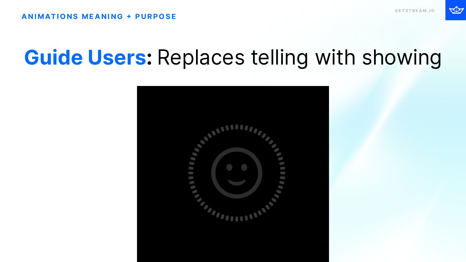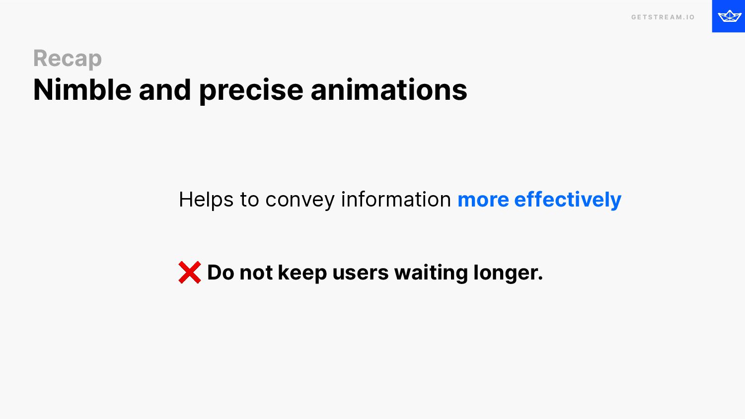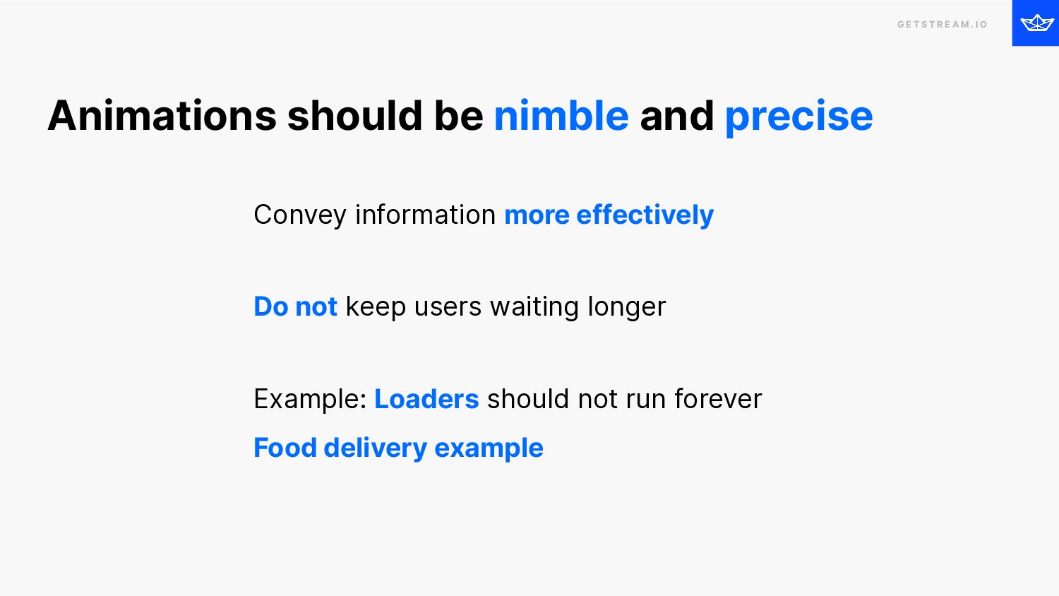 I O Convey information more effectively Do not keep users waiting longer Example: Loaders should not run forever Food delivery example Animations should be nimble and precise