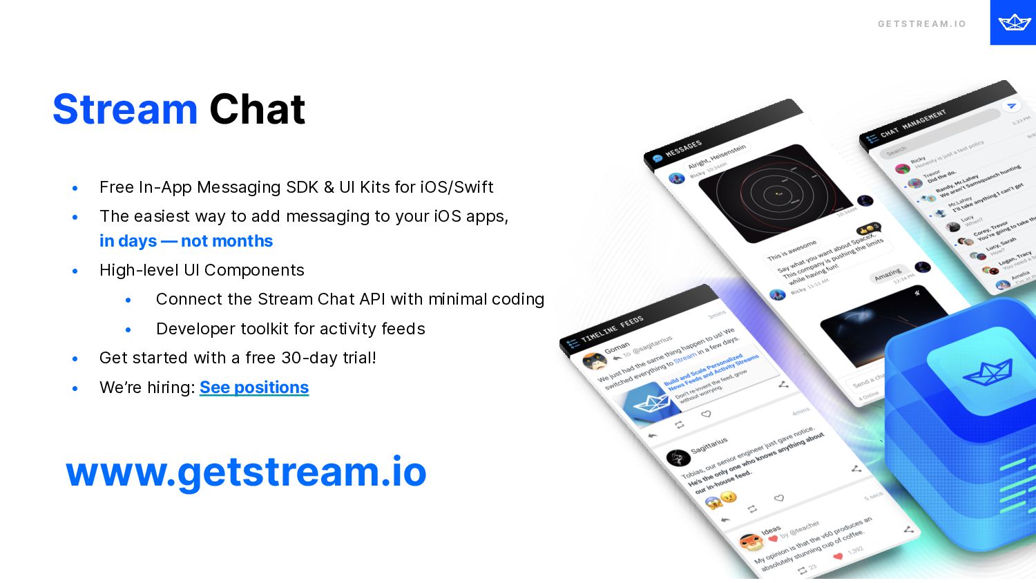 I O Stream Chat • Free In-App Messaging SDK & UI Kits for iOS/Swift • The easiest way to add messaging to your iOS apps, in days — not months • High-level UI Components • Connect the Stream Chat API with minimal coding • Developer toolkit for activity feeds • Get started with a free 30-day trial! • We’re hiring: See positions www.getstream.io