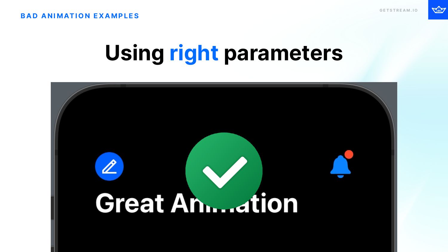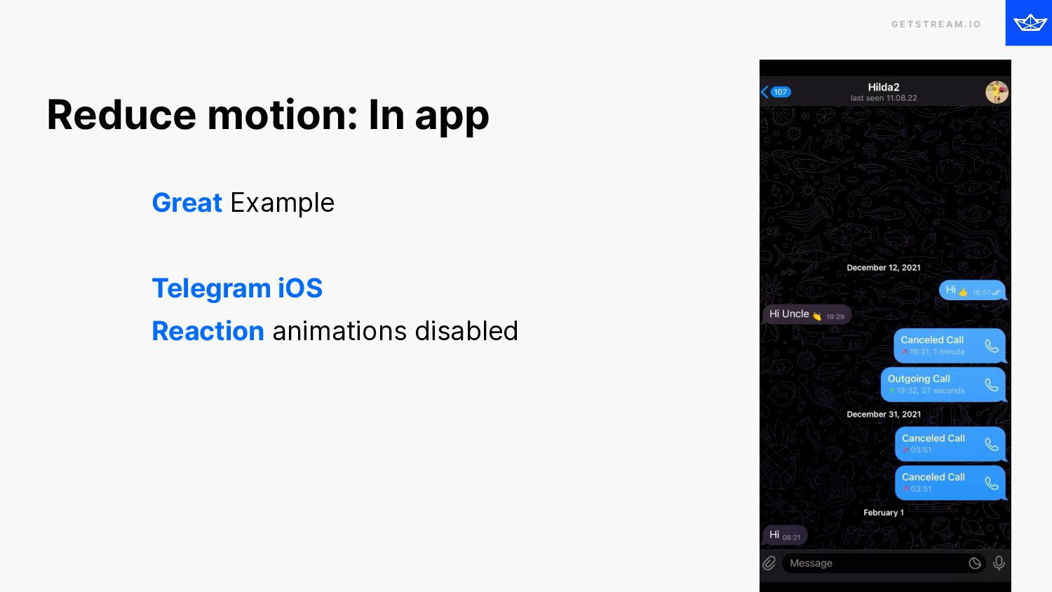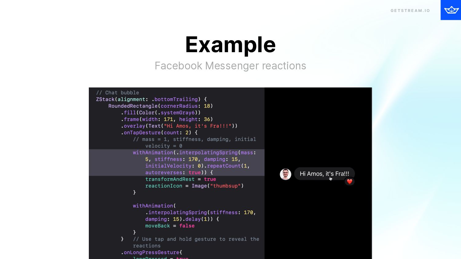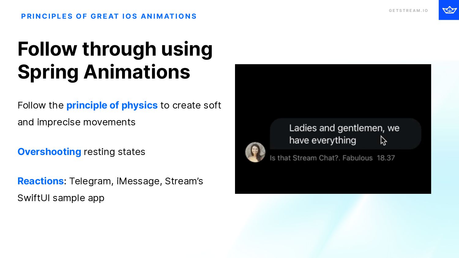 I O P R I N C I P L E S O F G R E AT I O S A N I M AT I O N S Follow through using Spring Animations Follow the principle of physics to create soft and imprecise movements Overshooting resting states Reactions: Telegram, iMessage, Stream’s SwiftUI sample app