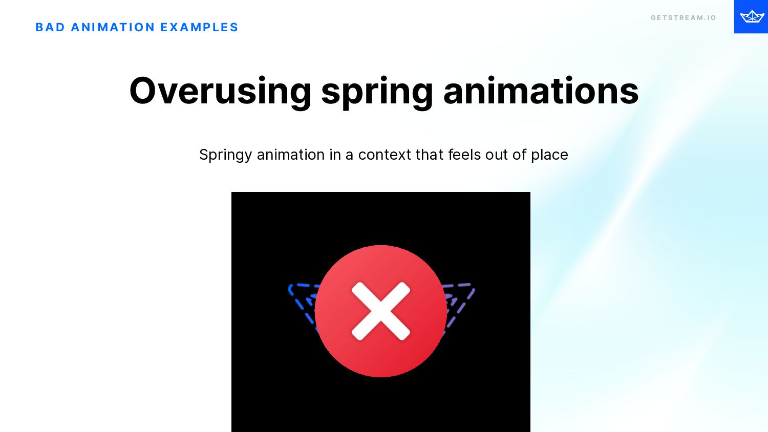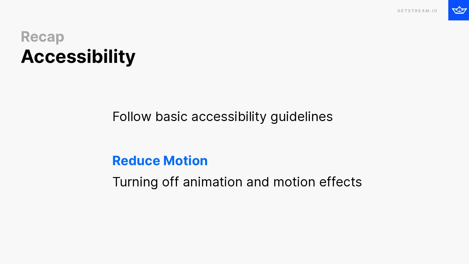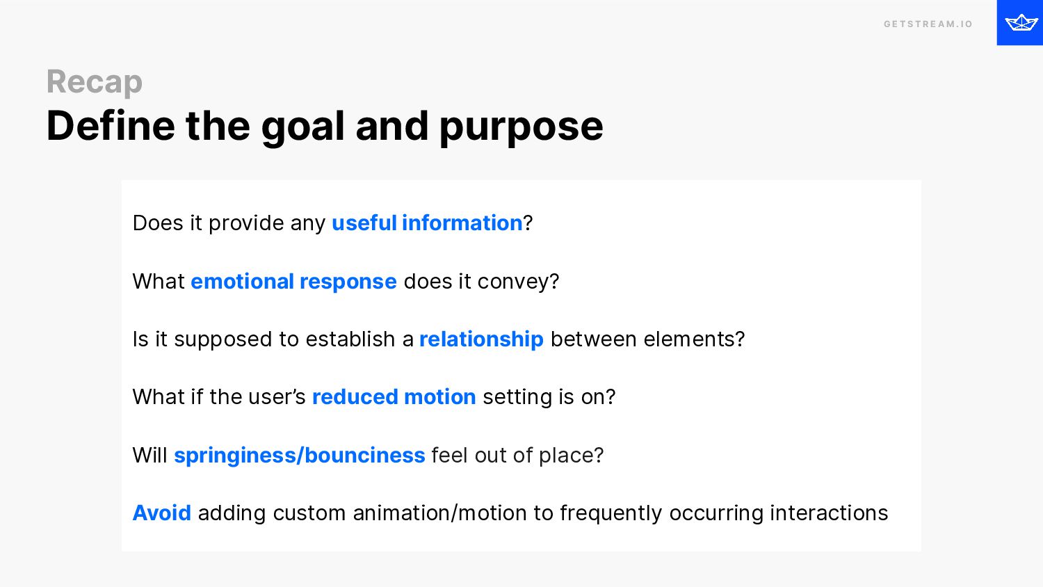 I O Does it provide any useful information? What emotional response does it convey? Is it supposed to establish a relationship between elements? What if the user’s reduced motion setting is on? Will springiness/bounciness feel out of place? Avoid adding custom animation/motion to frequently occurring interactions Recap Define the goal and purpose