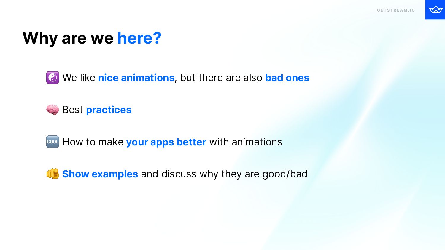 I O Why are we here? ☯ We like nice animations, but there are also bad ones 🧠 Best practices 🆒 How to make your apps better with animations 🫵 Show examples and discuss why they are good/bad