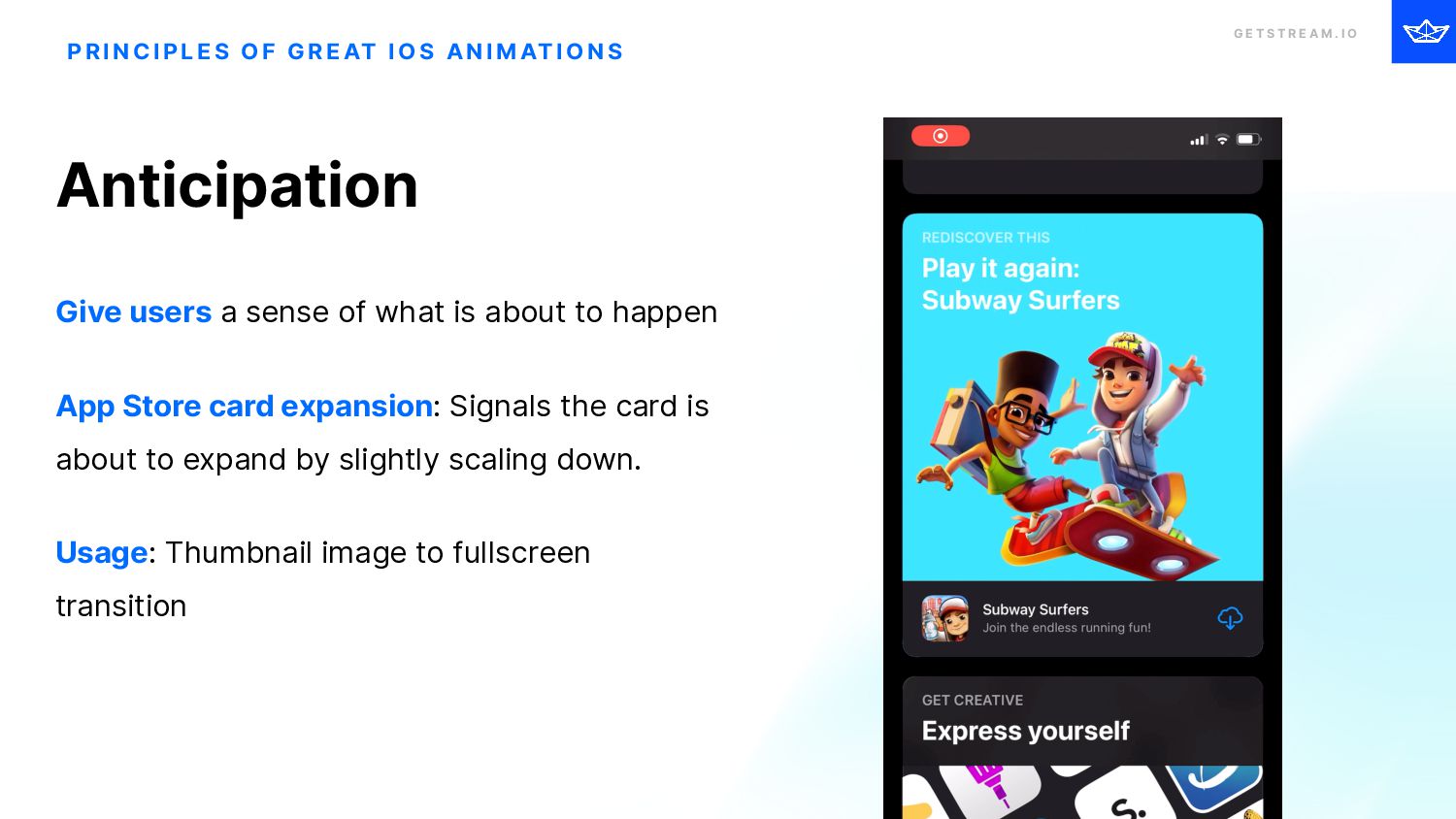 I O P R I N C I P L E S O F G R E AT I O S A N I M AT I O N S Anticipation Give users a sense of what is about to happen App Store card expansion: Signals the card is about to expand by slightly scaling down. Usage: Thumbnail image to fullscreen transition