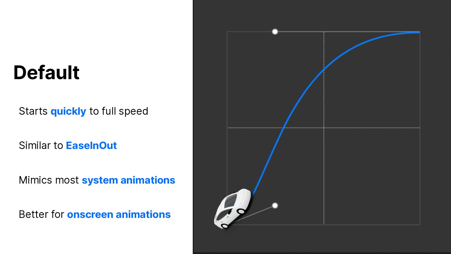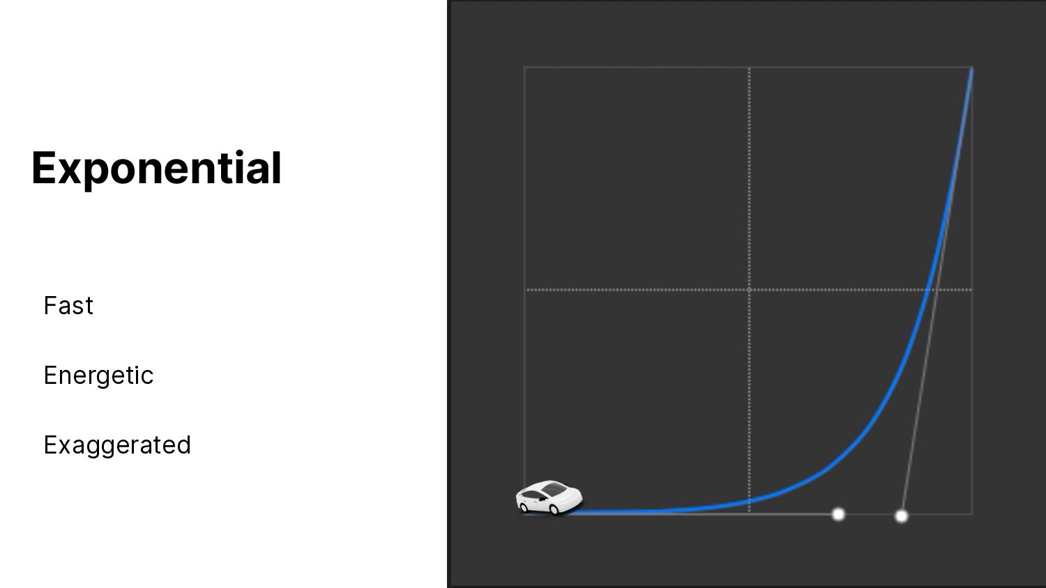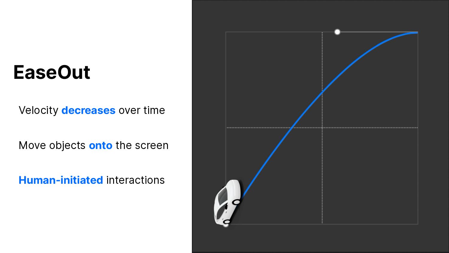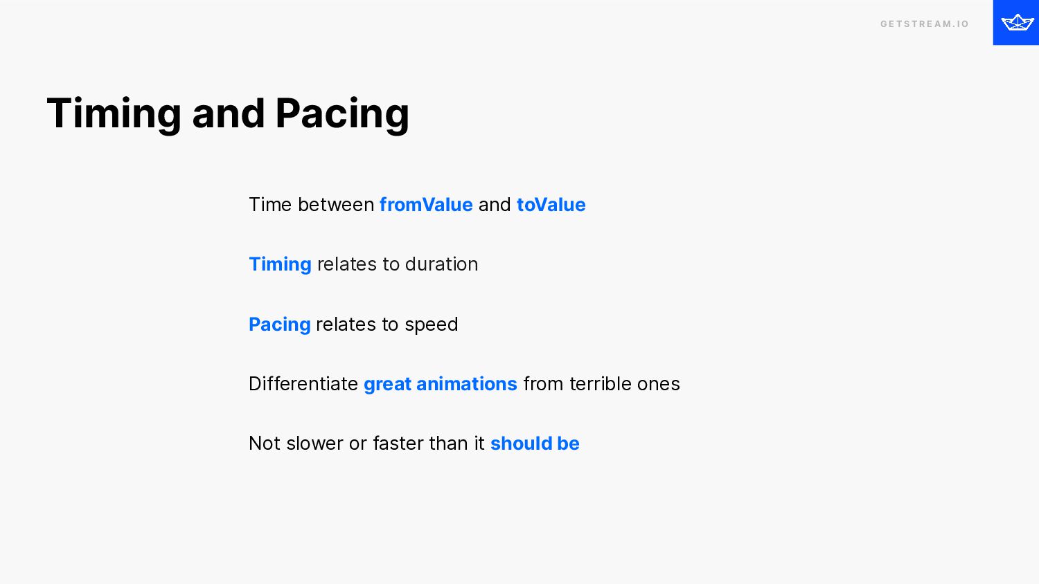 I O Time between fromValue and toValue Timing relates to duration Pacing relates to speed Differentiate great animations from terrible ones Not slower or faster than it should be Timing and Pacing